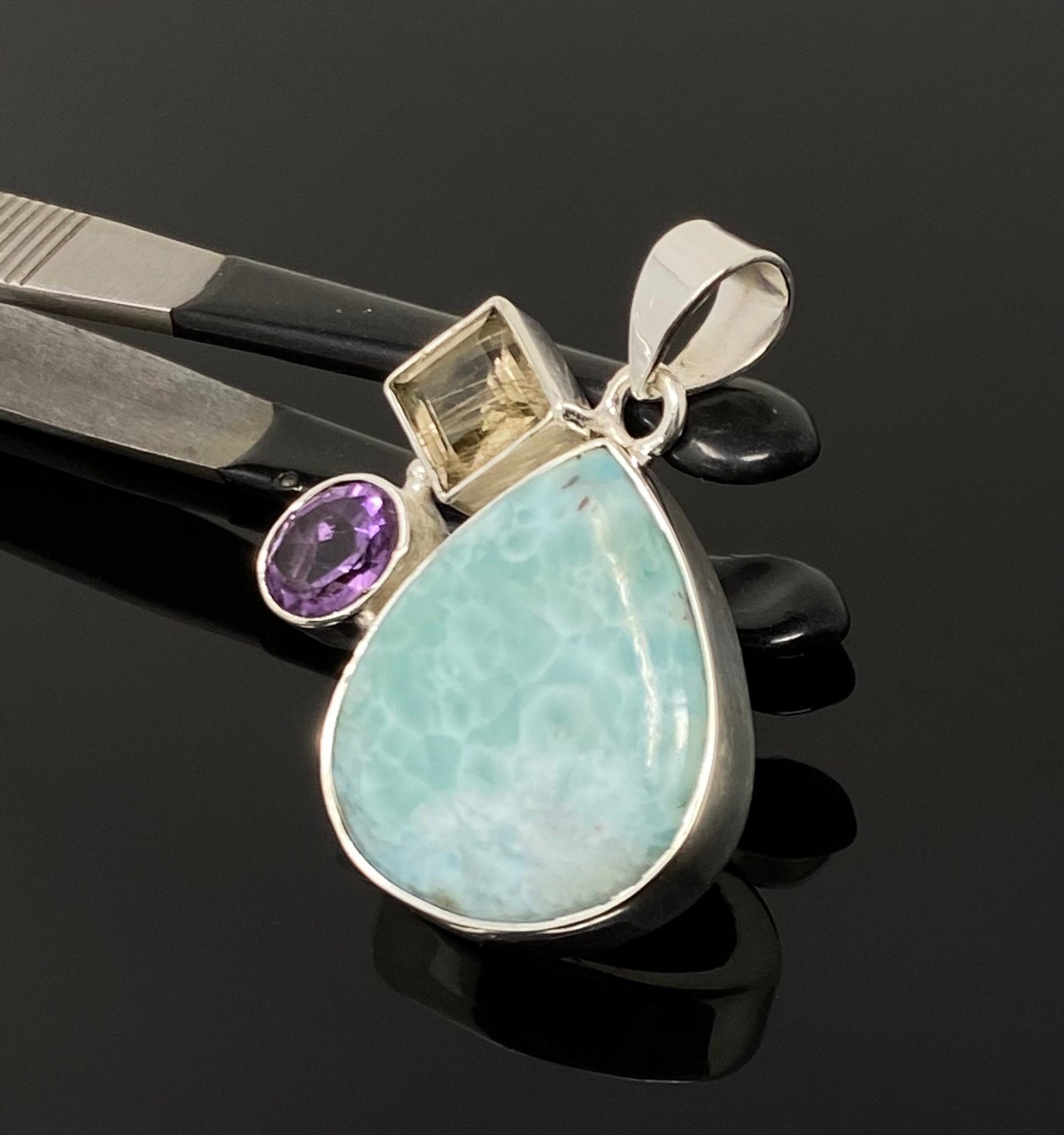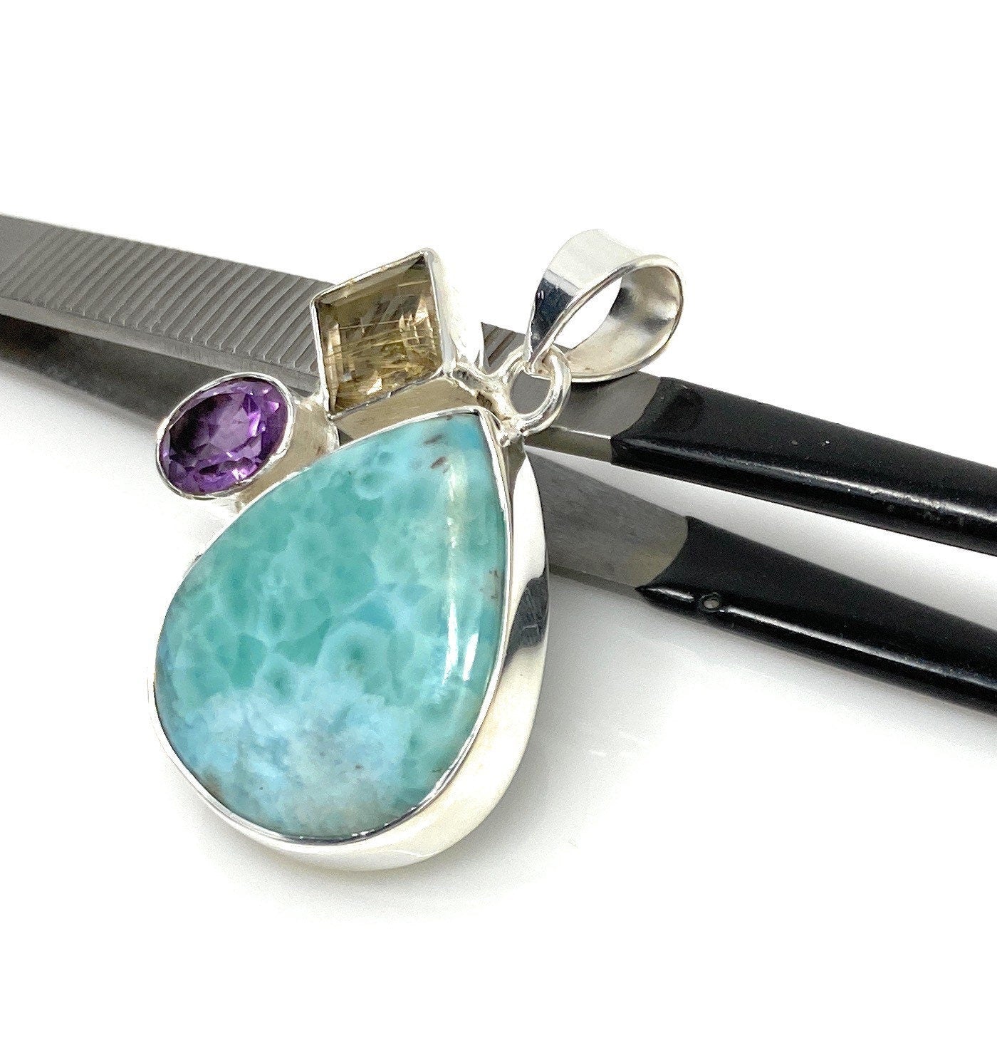 This Beautiful Handmade 925 Sterling Silver Designer Pendant is made with using Larimar, Golden Rutile and Amethyst and is an excellent choice for any occasion and makes a great gift for the loved ones.