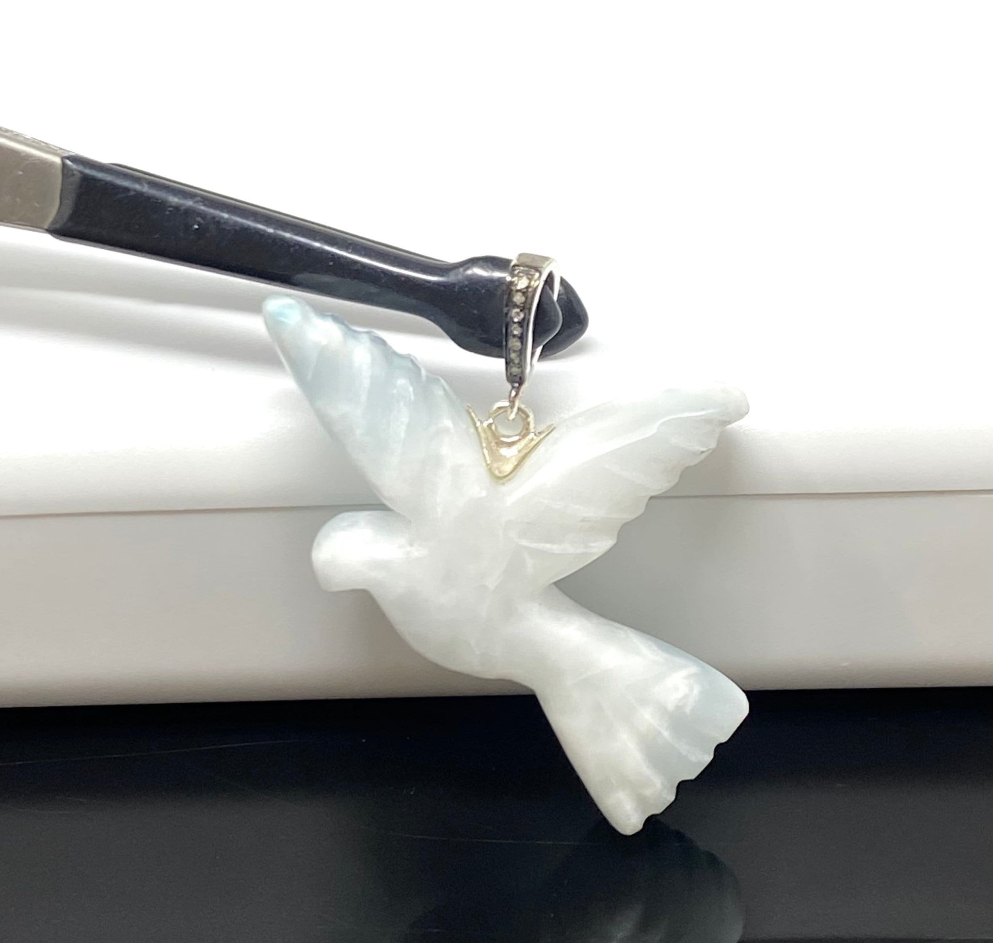 This exquisite pendant is more than just a piece of jewelry - it's a talisman that connects you to the divine. The soothing blue hues of larimar are said to calm the mind and open the heart, while the white dove bird symbolizes freedom, peace, and the power of the spirit. Wear it as a daily reminder to embrace your own inner light and let your soul soar.