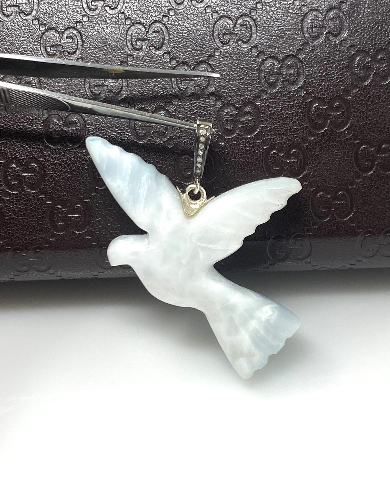 Discover the captivating beauty of the White Dove Larimar Diamond Pendant - a stunning piece of spiritual jewelry that will elevate your style and soothe your soul.