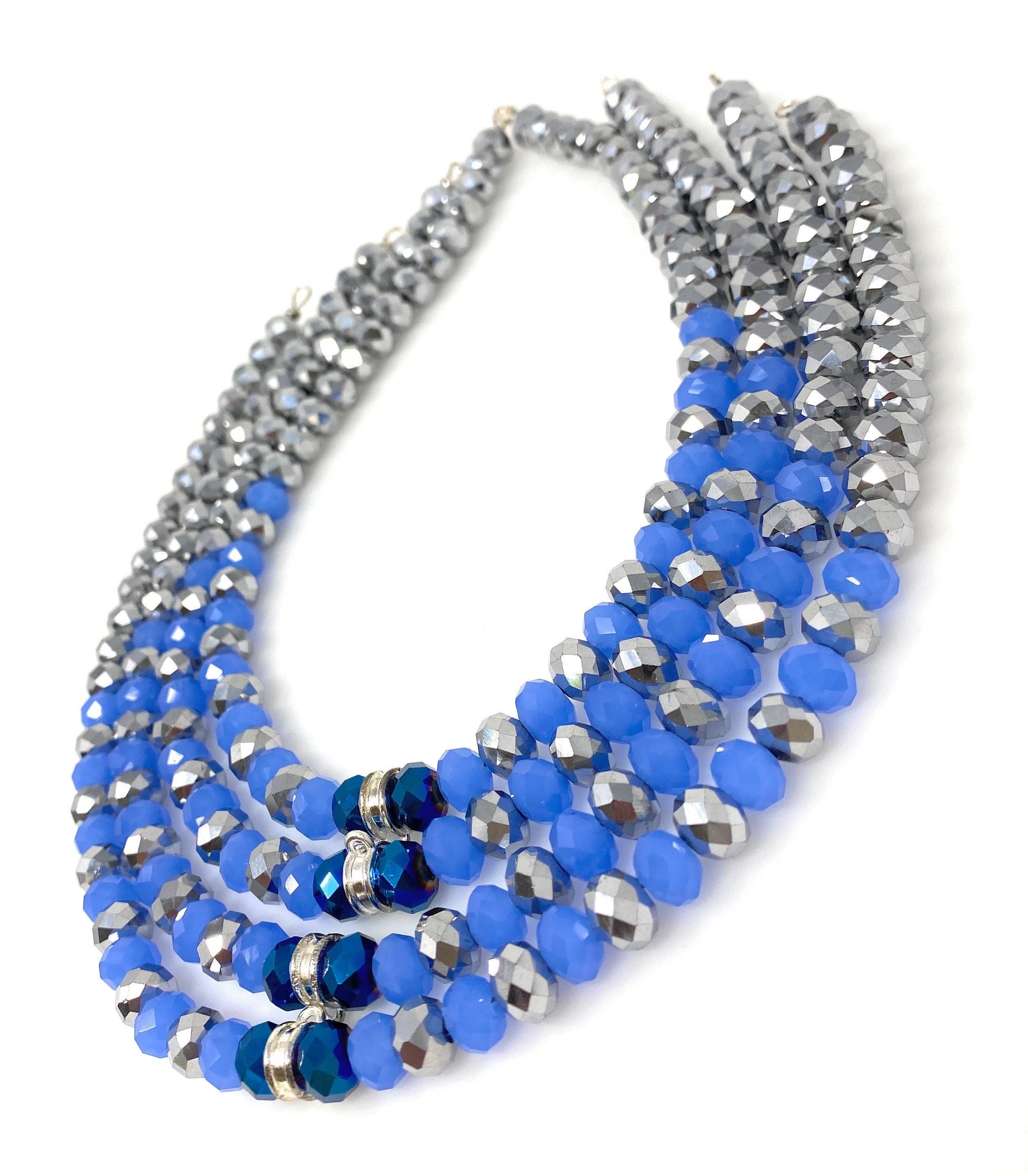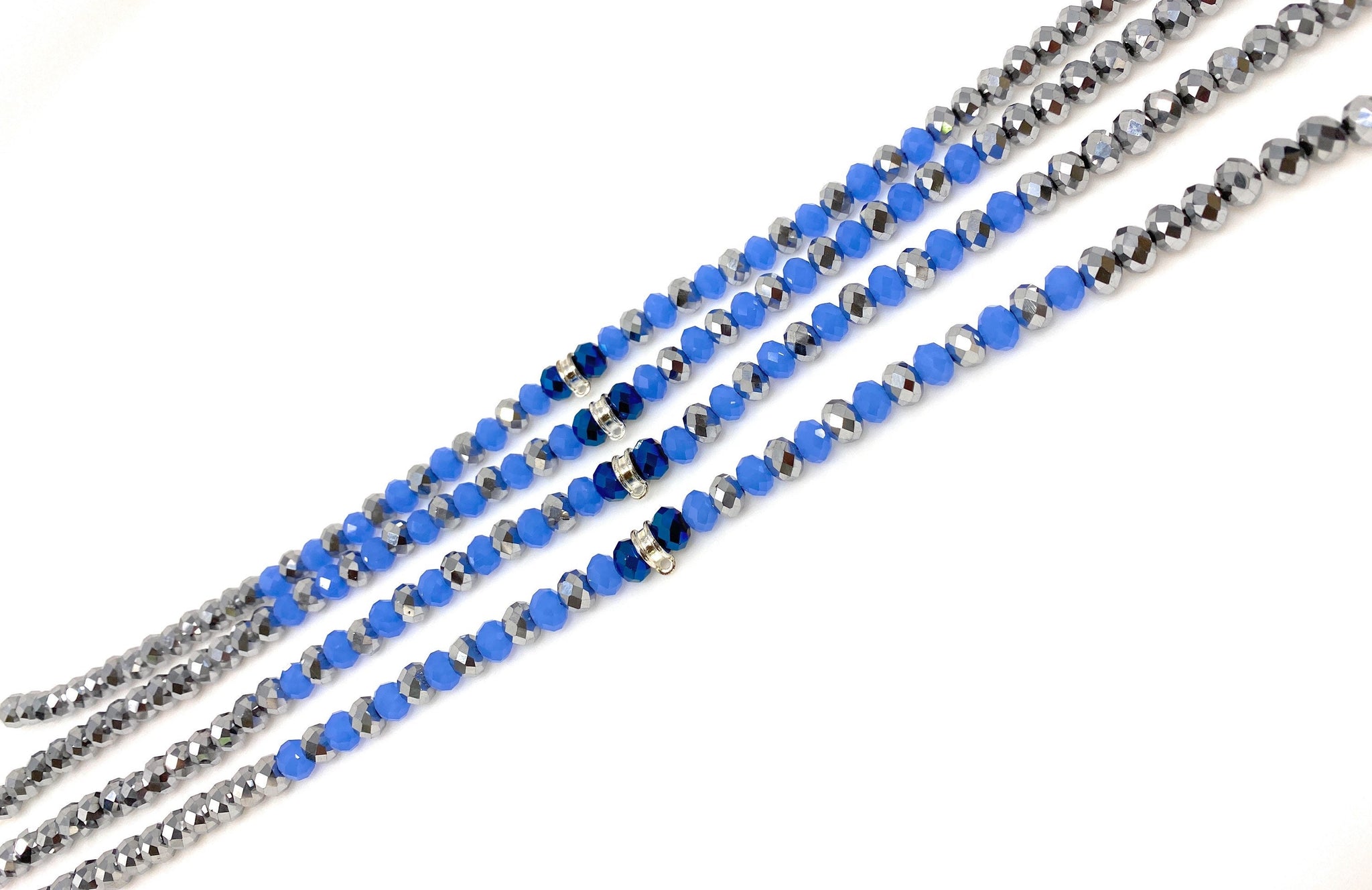 Faceted Glass Rondelle Beads, Opaque Blue and Metallic Silver Glass Beads, 8x6mm , 13.5” Strand