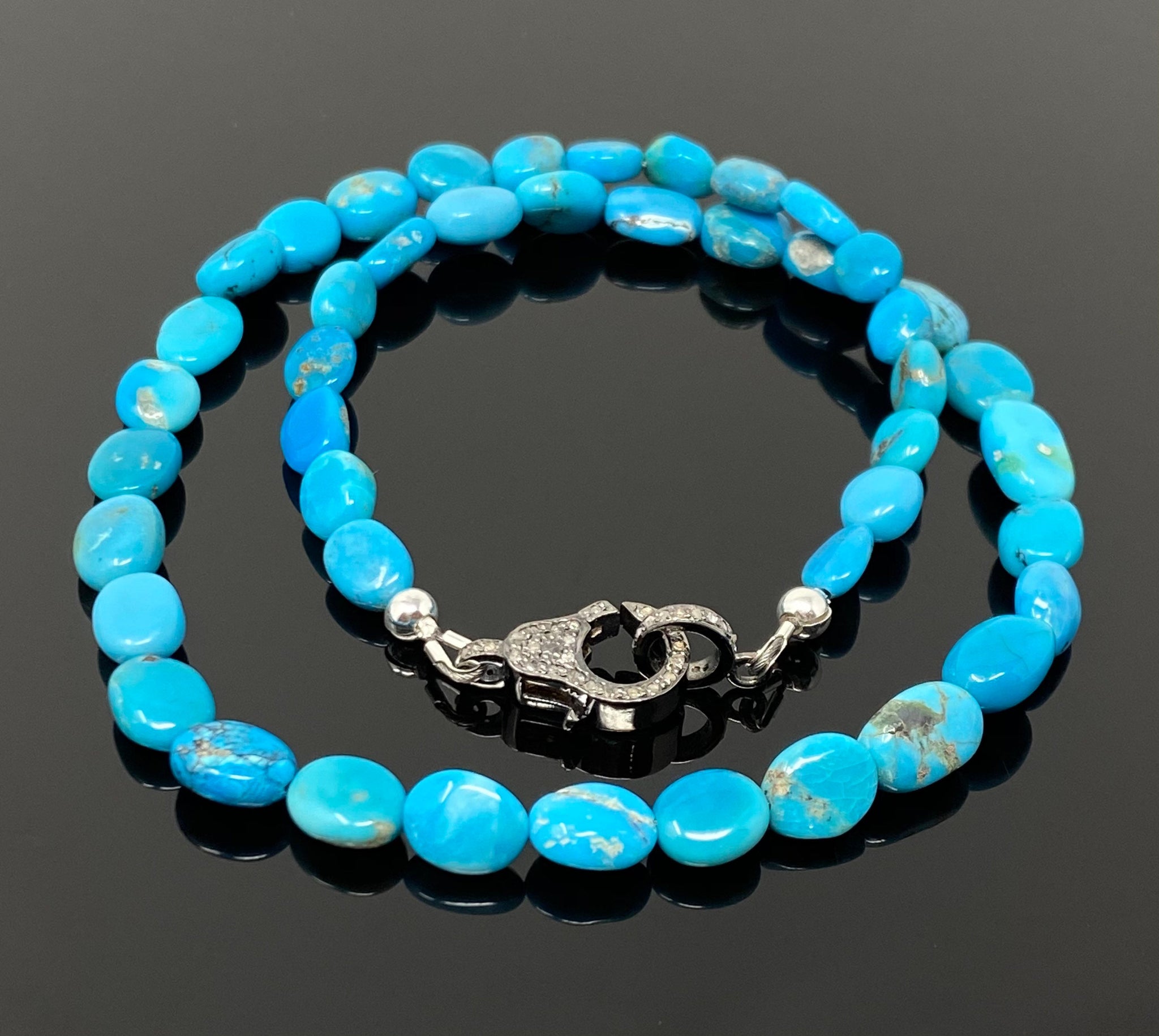 Natural Arizona Turquoise AAA Quality Beaded Necklace with Genuine Pave Diamonds in the Clasp.