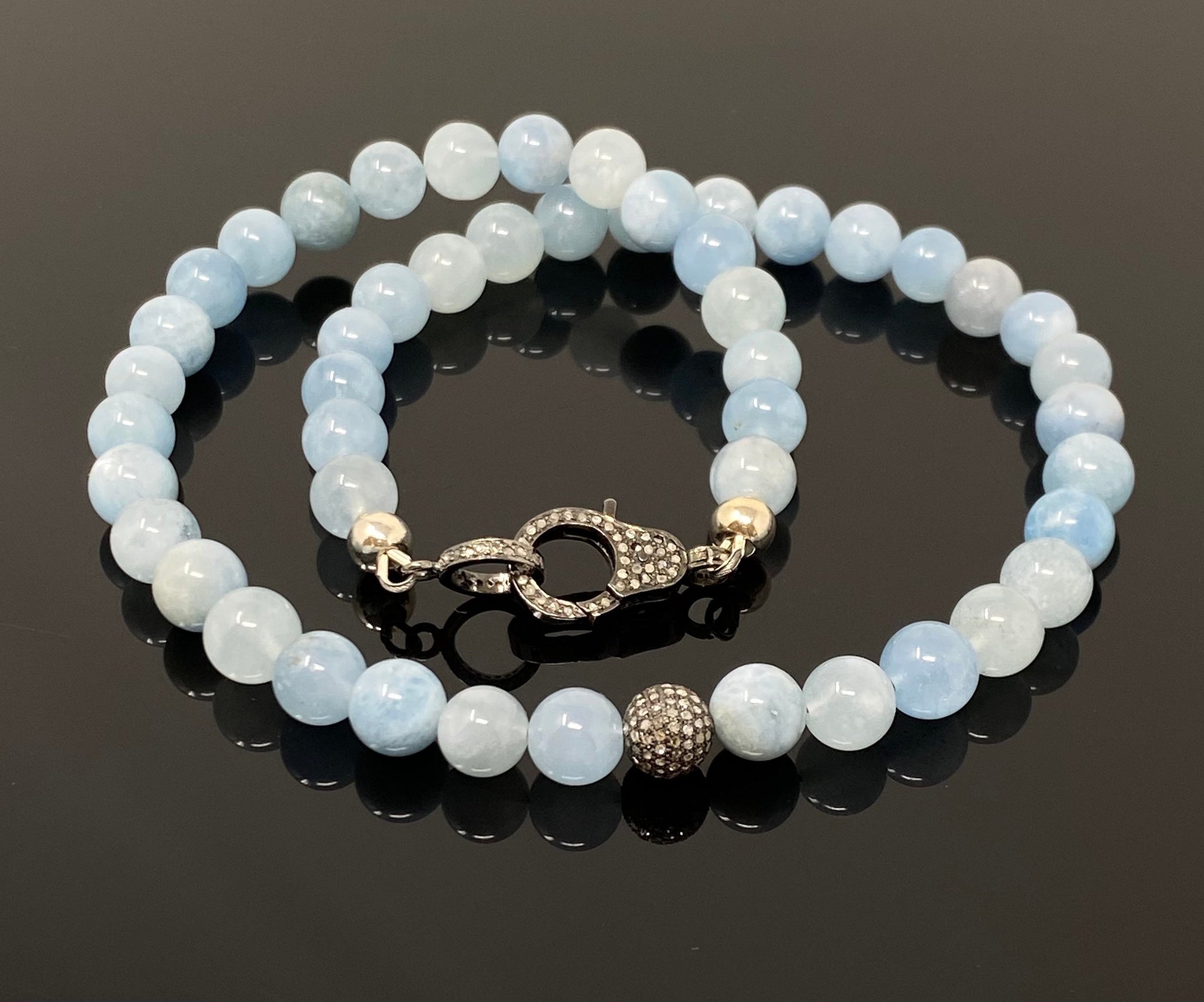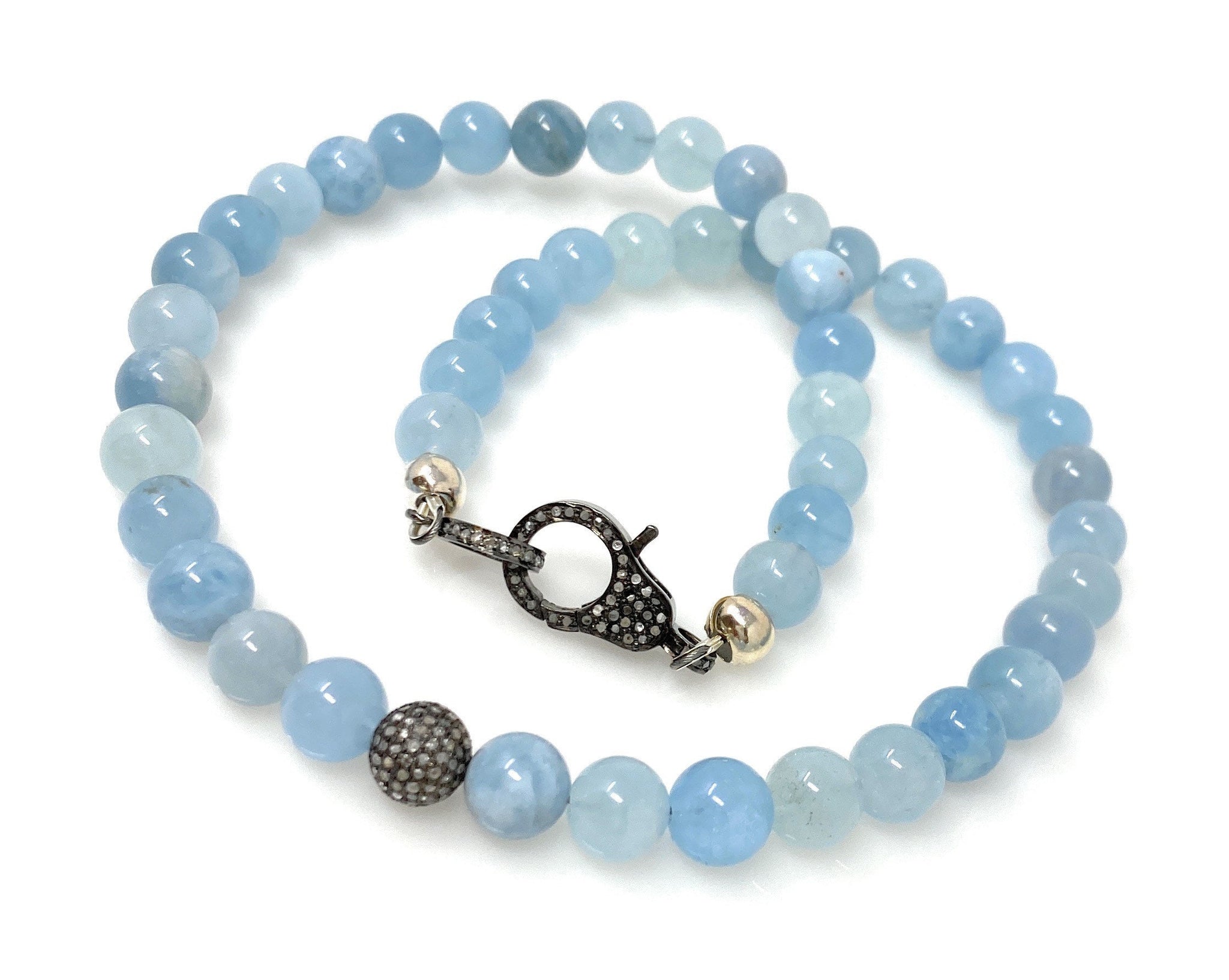 Natural Aquamarine Beaded Necklace with Genuine Pave Diamonds in the Clasp and Pave Diamond Bead .