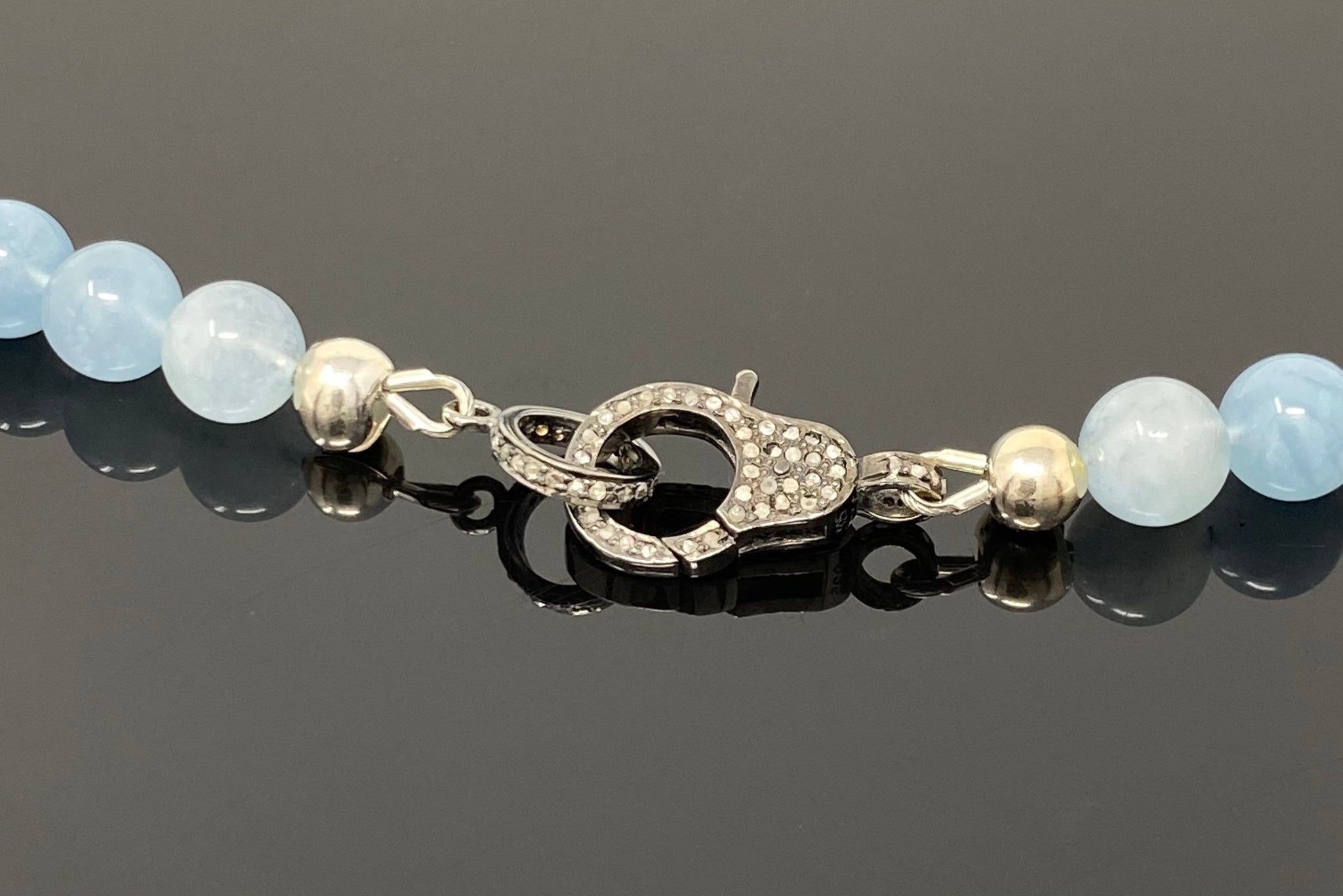 This Necklace is Handmade by using Smooth Natural Aquamarine Gemstone Beads , Genuine Pave Diamond Bead and Genuine Pave Diamond Clasp .