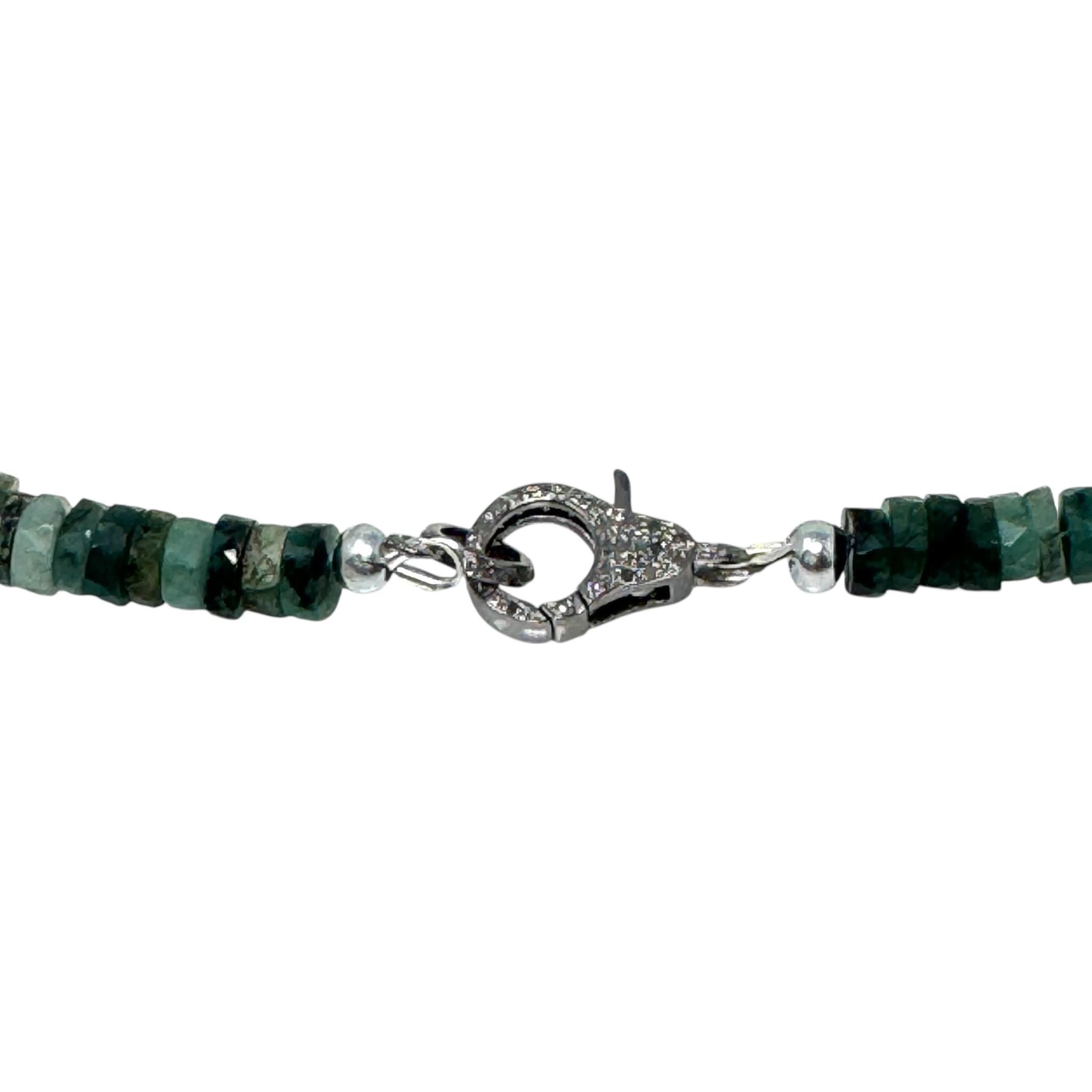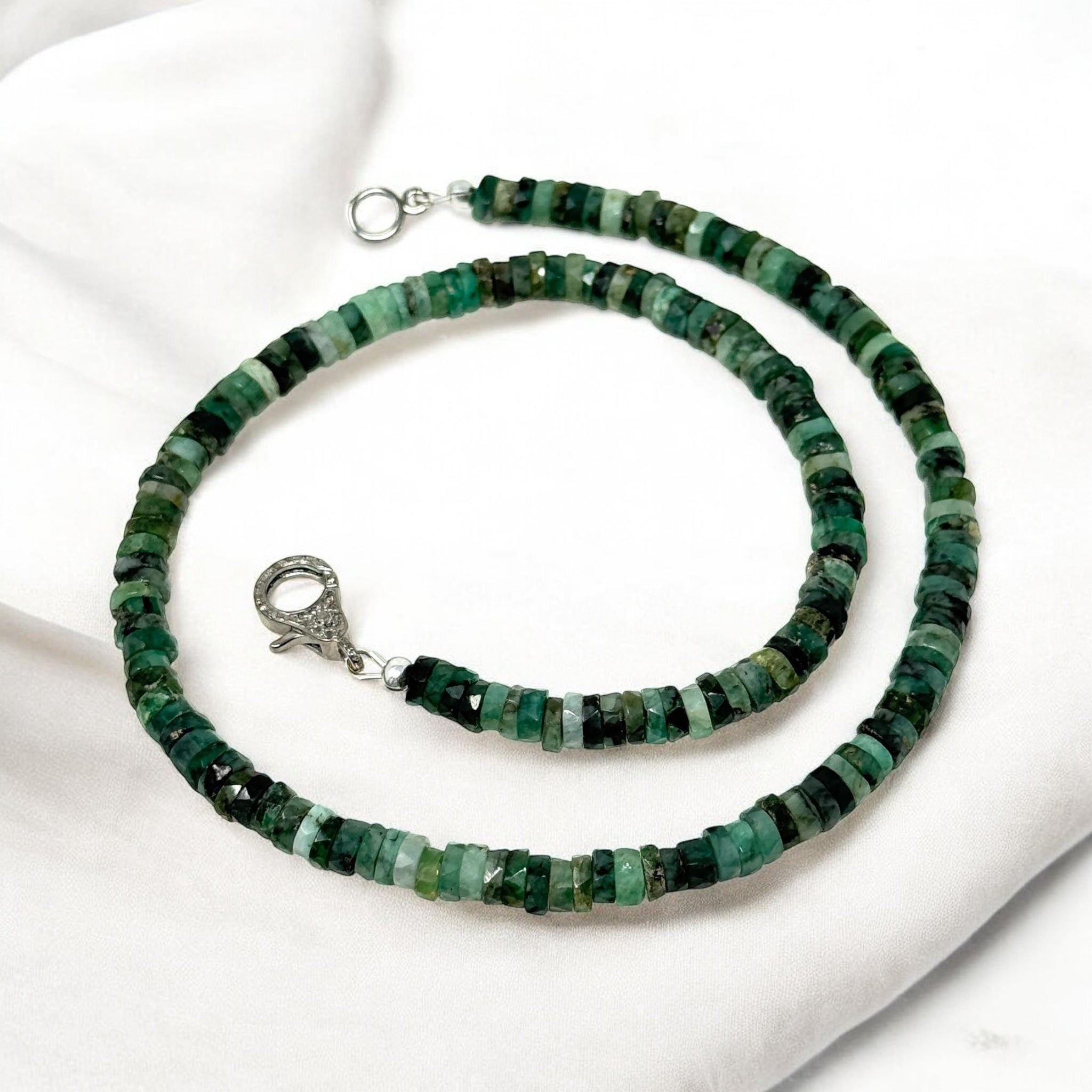 Natural Emerald Faceted Heishi Beaded Handmade Necklace with Genuine Pave Diamonds in the Clasp.