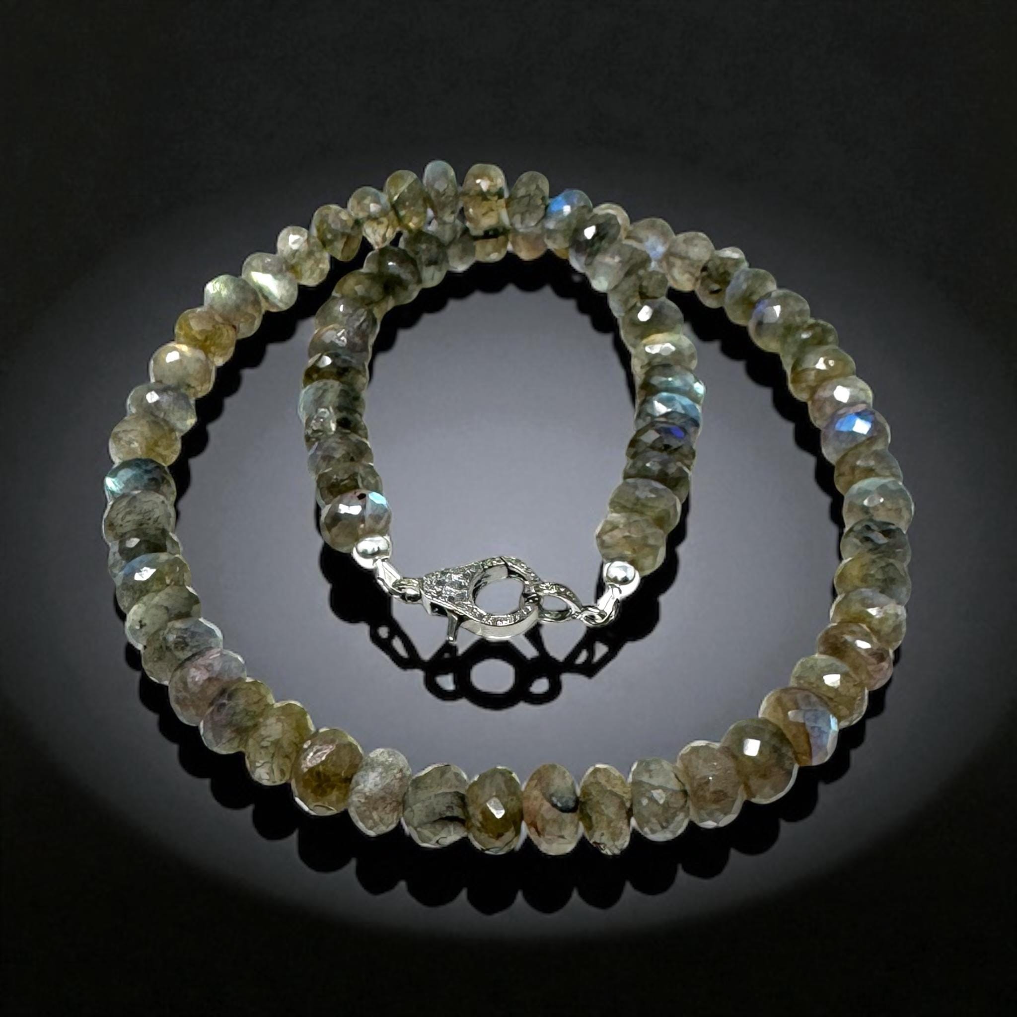 17.25” Natural Labradorite Necklace with Pave Diamond Clasp, Spiritual Healing Crystal Jewelry, Chakra Balancing Jewelry Gifts for Her