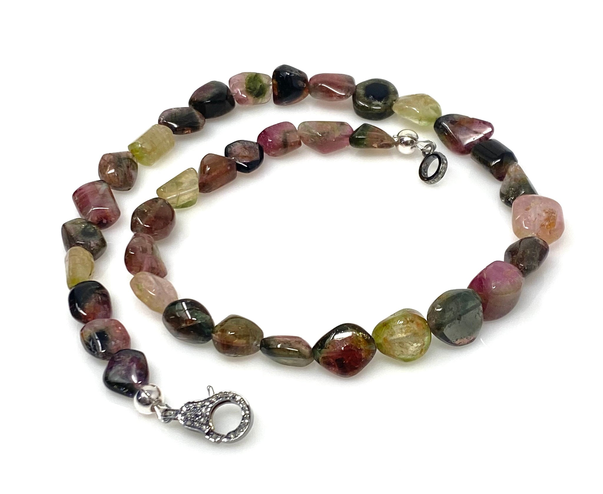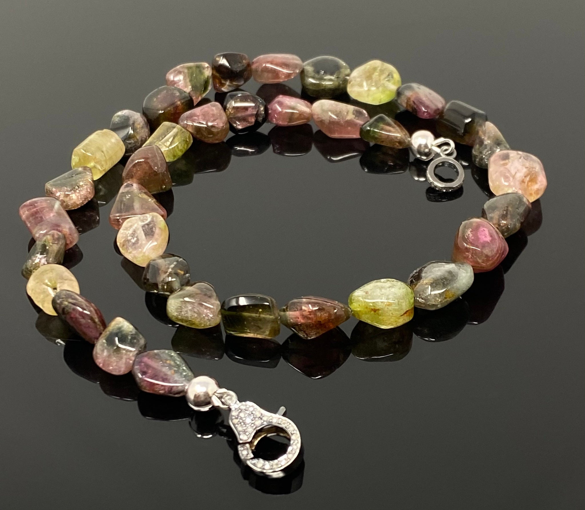 17.25” Tourmaline Necklace with Pave Diamond Clasp, Natural Bicolor Tourmaline Gemstone Necklace, Spiritual Healing Crystal Chakra Jewelry