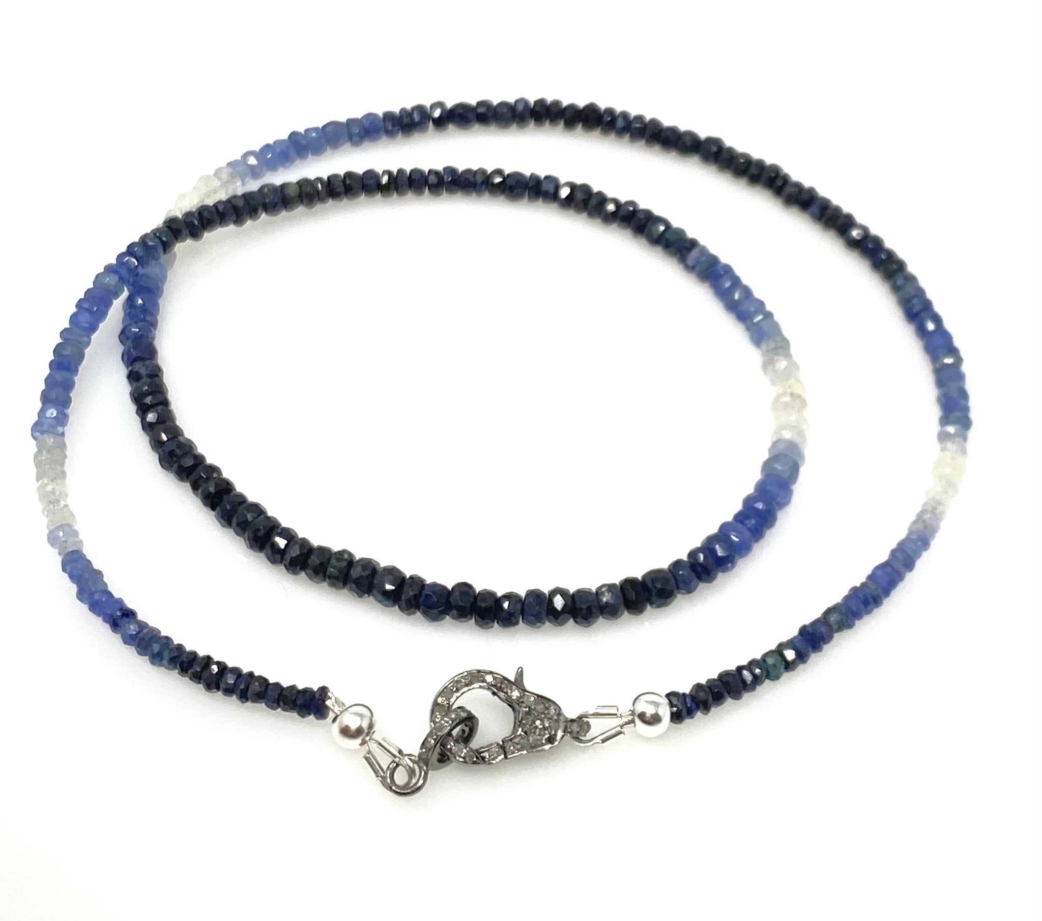 Natural Shaded Blue and White Sapphire Faceted AAA Quality Beaded Necklace with Genuine Pave Diamonds in the Clasp.