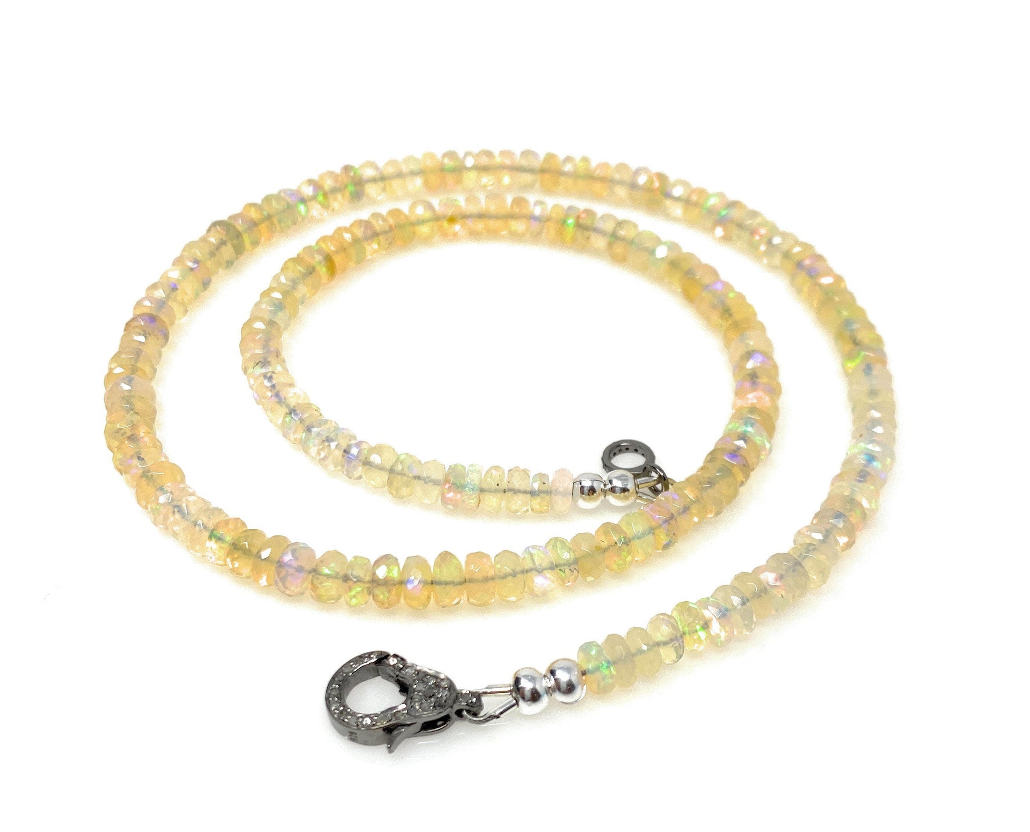 This Necklace is Handmade by using Faceted Natural Ethiopian Opal Gemstone Beads and Genuine Pave Diamond Clasp . The Clasp can be used in the back as well as in the front to add a Pendant if desired.