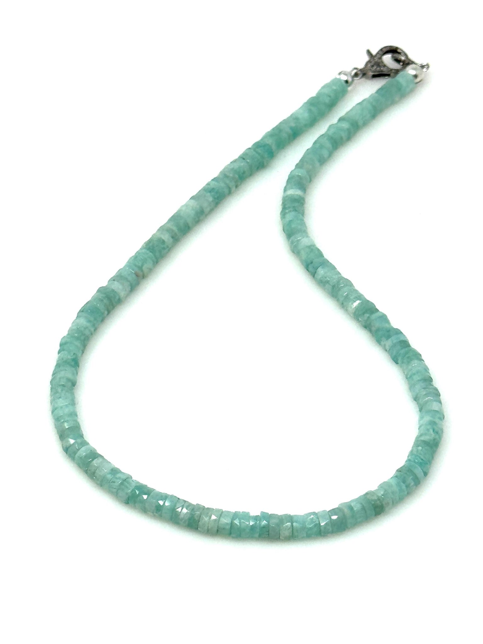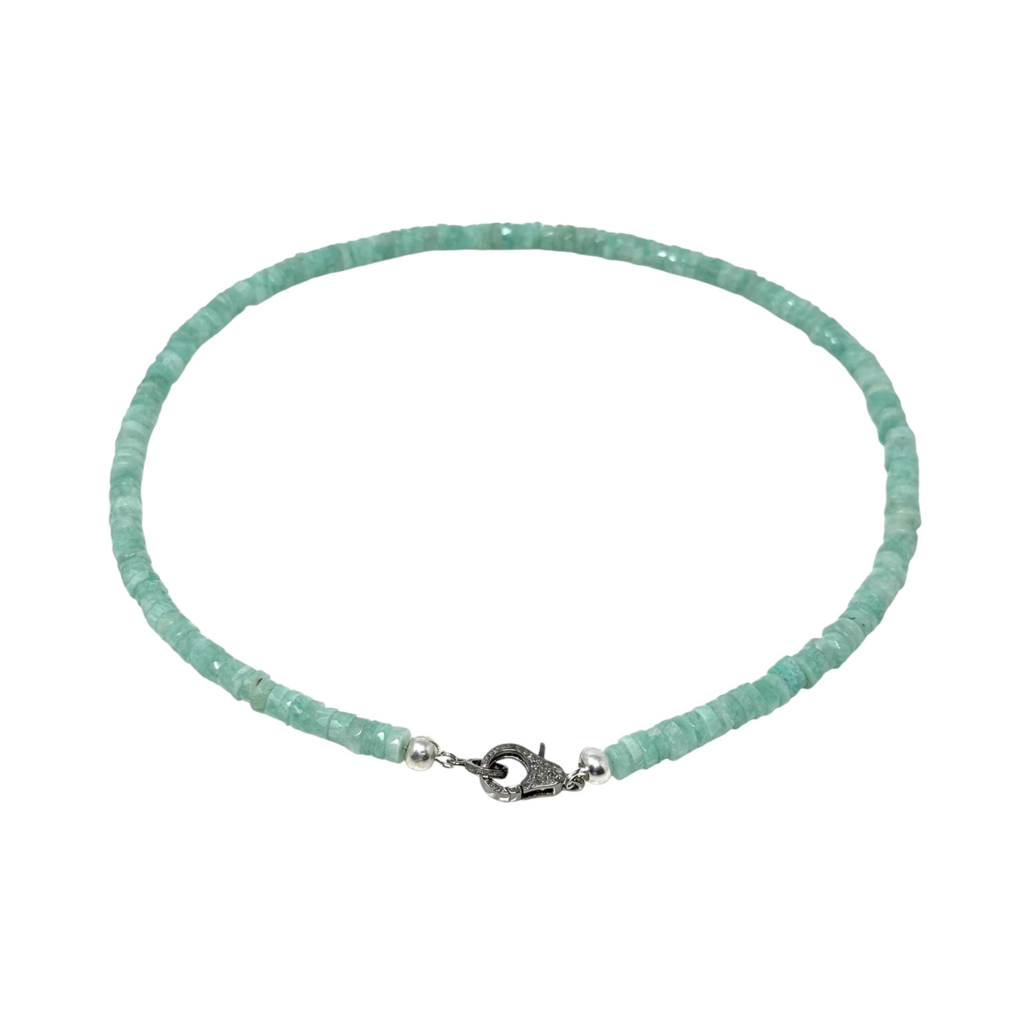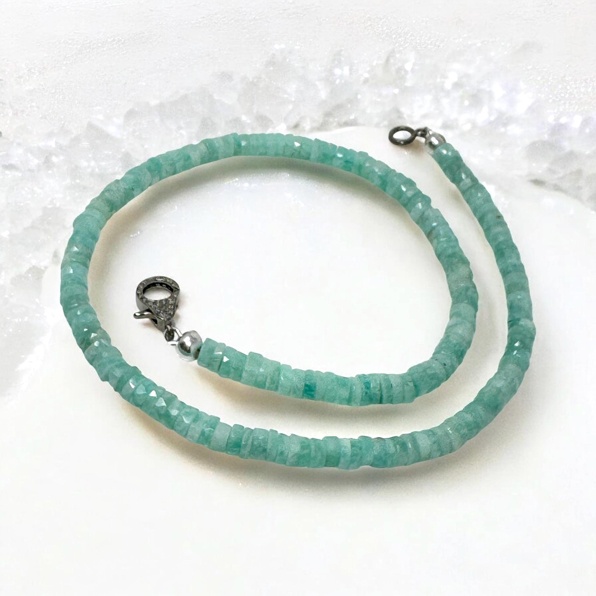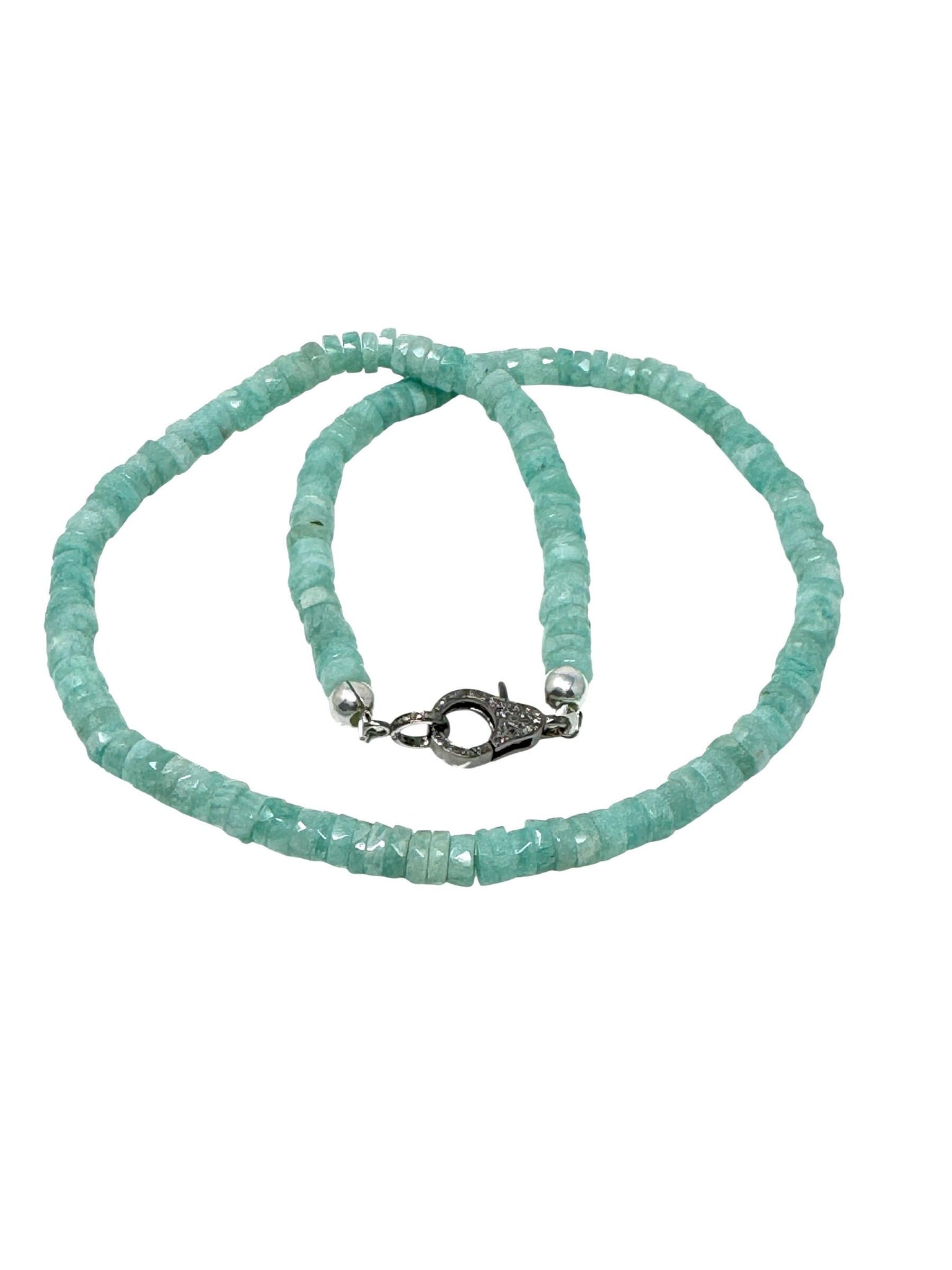 Natural Peruvian Amazonite Faceted Heishi Beaded Handmade Necklace with Genuine Pave Diamonds in the Clasp.