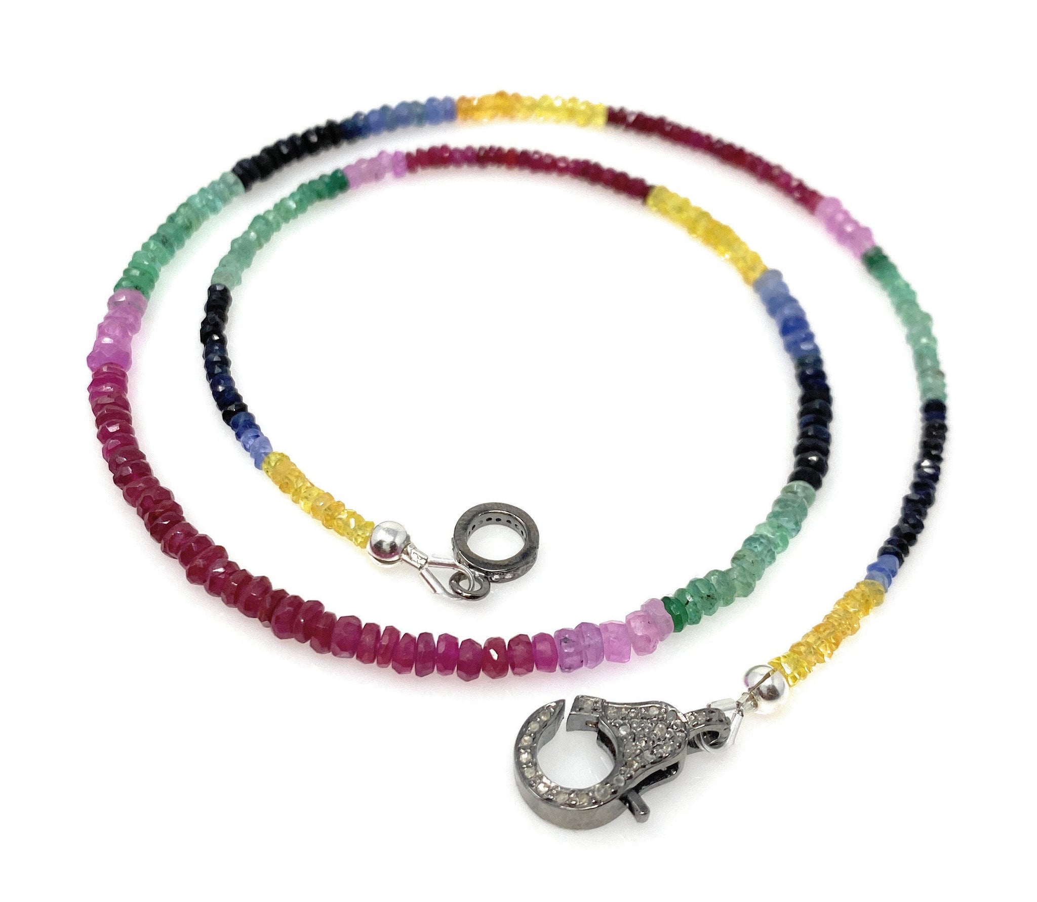 Genuine Ruby, Emerald and Sapphire Pave Diamond Necklace, Natural Multi Precious Beaded Gemstone Necklace, Spiritual Healing Crystal Jewelry