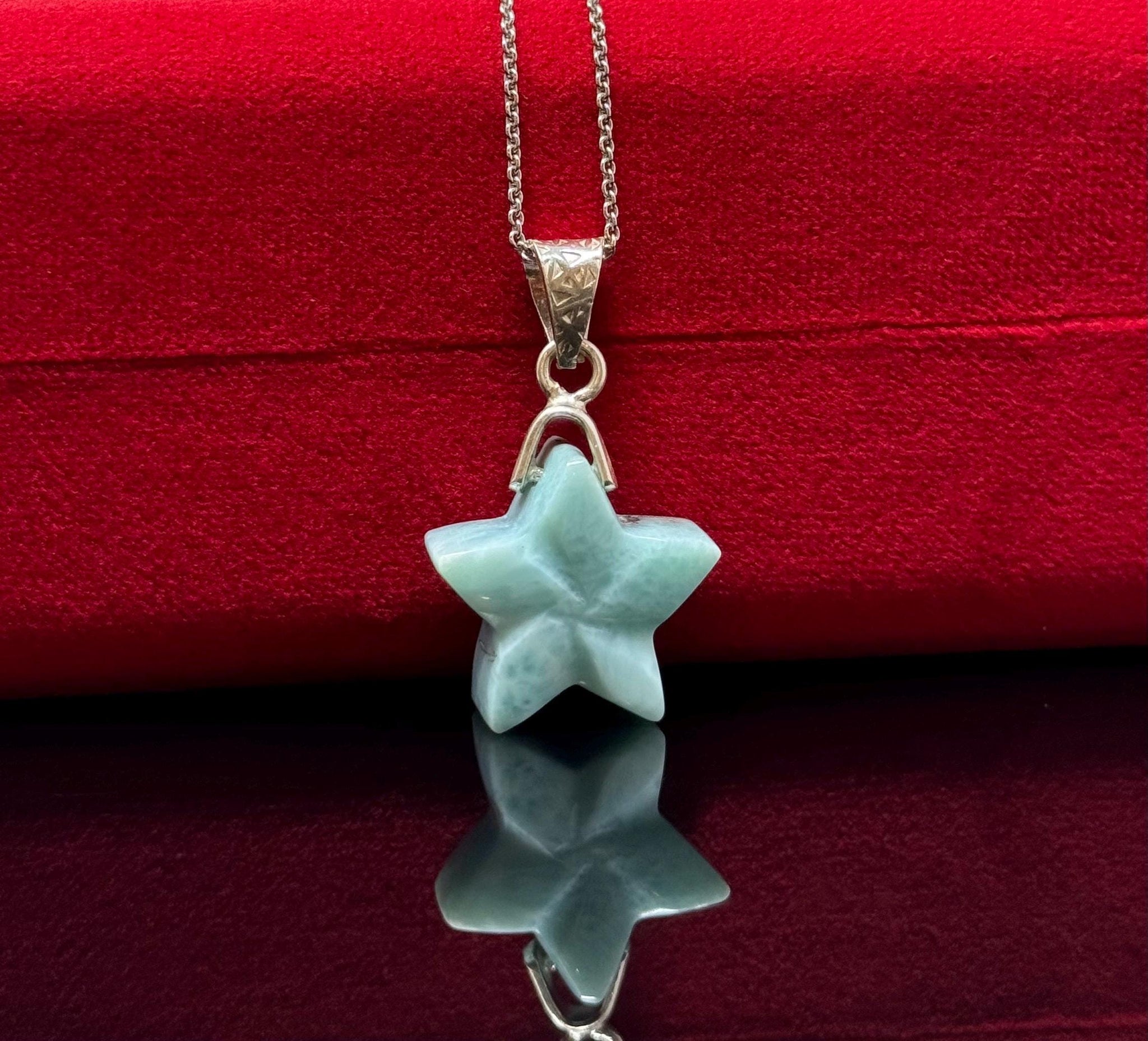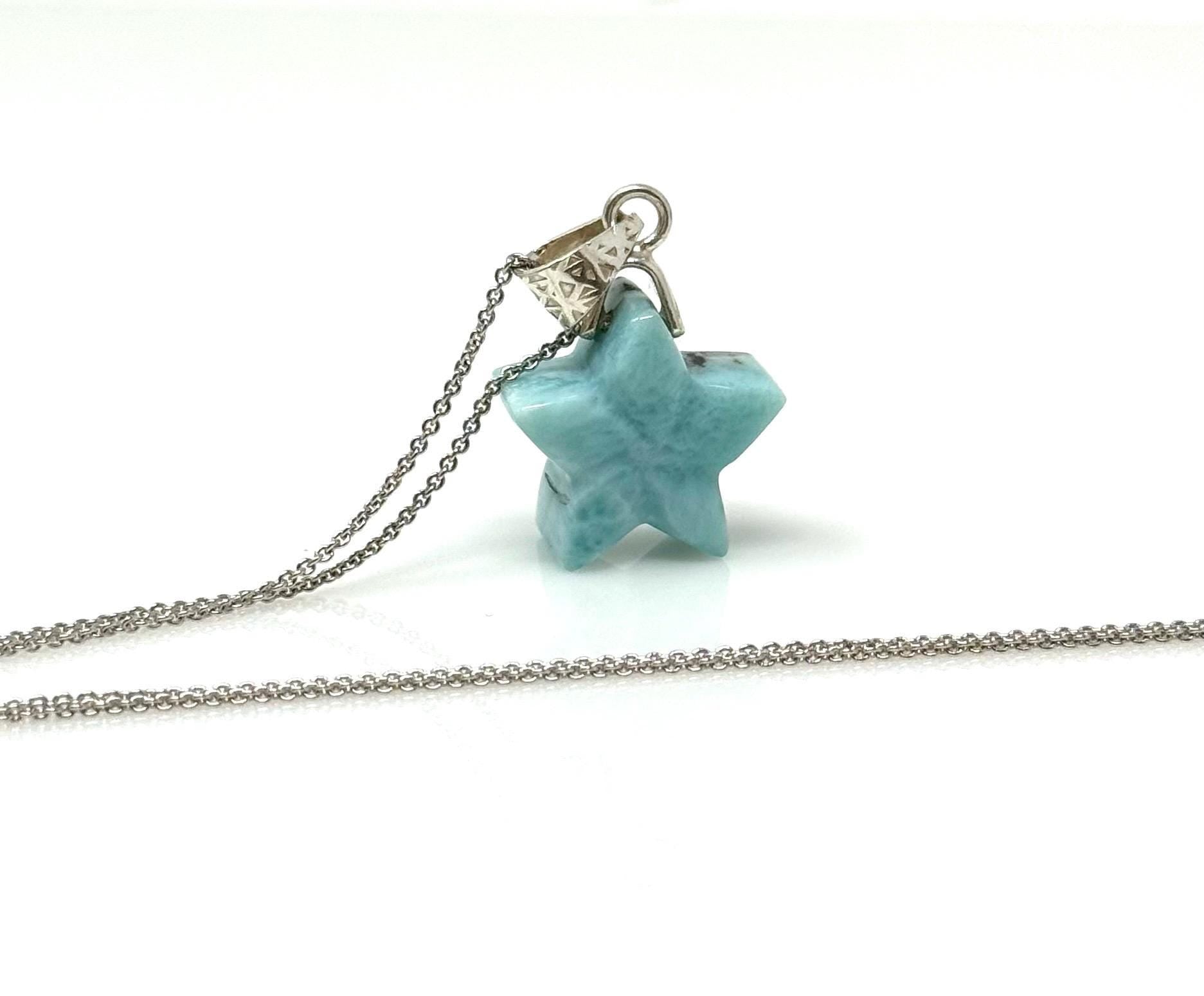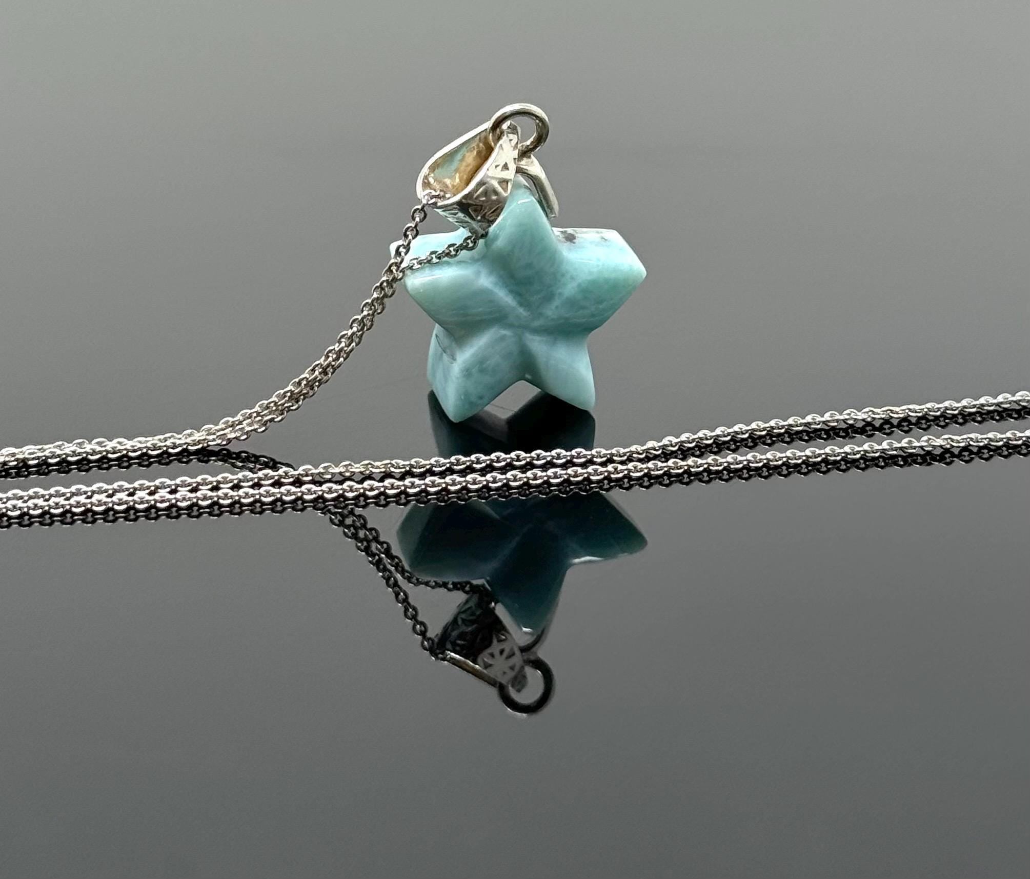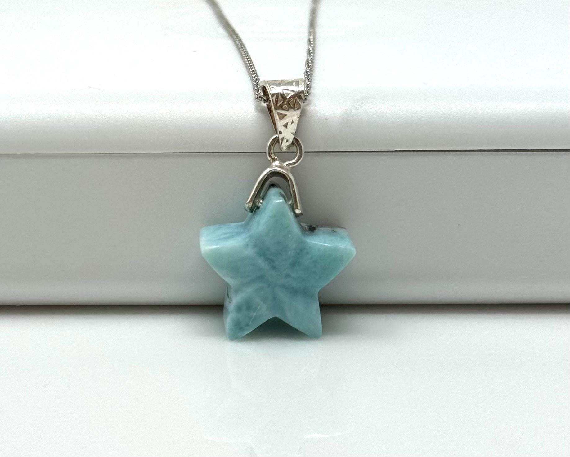 Larimar Gemstone Necklace, Hand Carved Larimar Star Necklace, Bohemian Jewelry, Dominican Republic Larimar Necklace, 1.30”x 0.75”