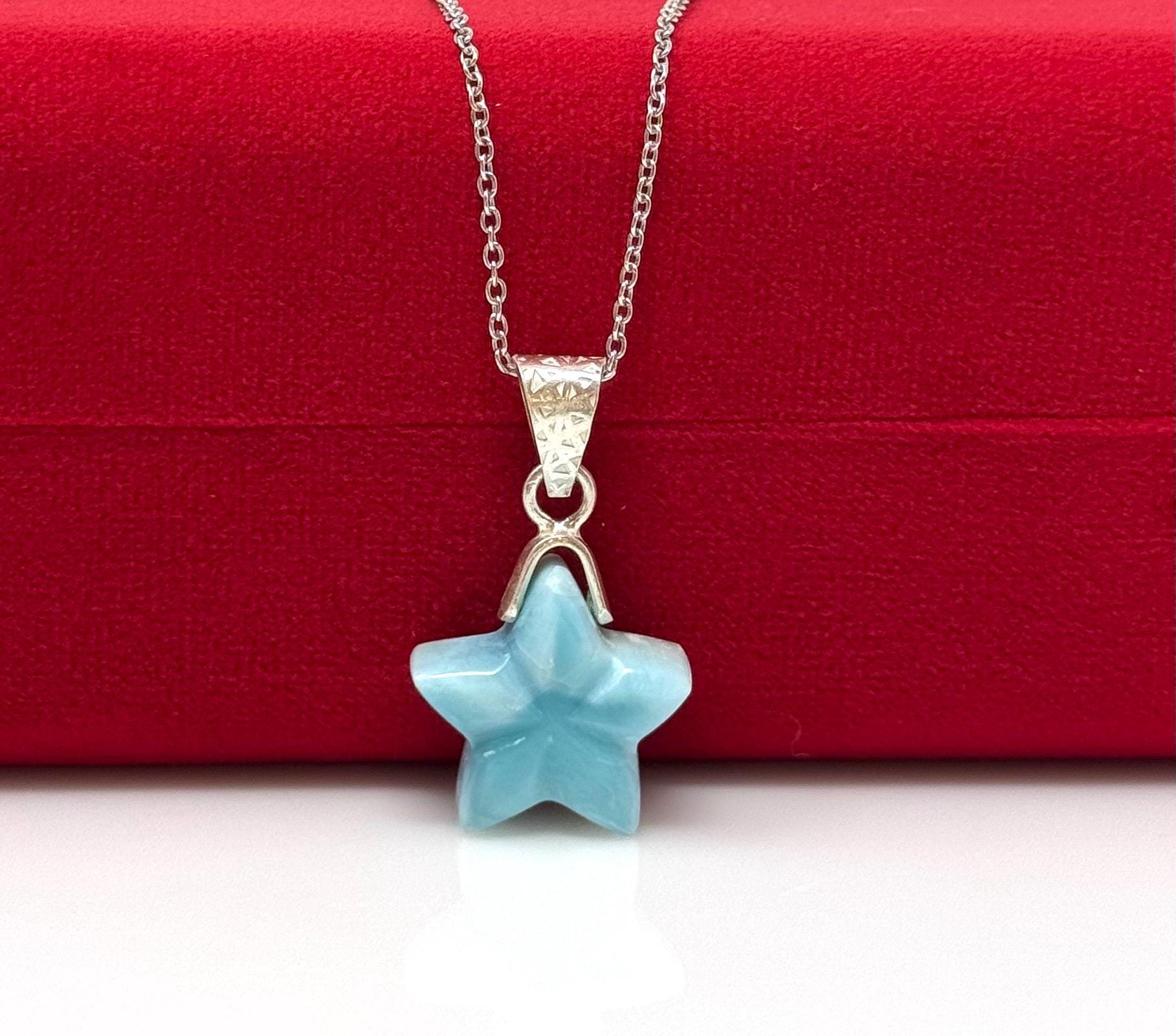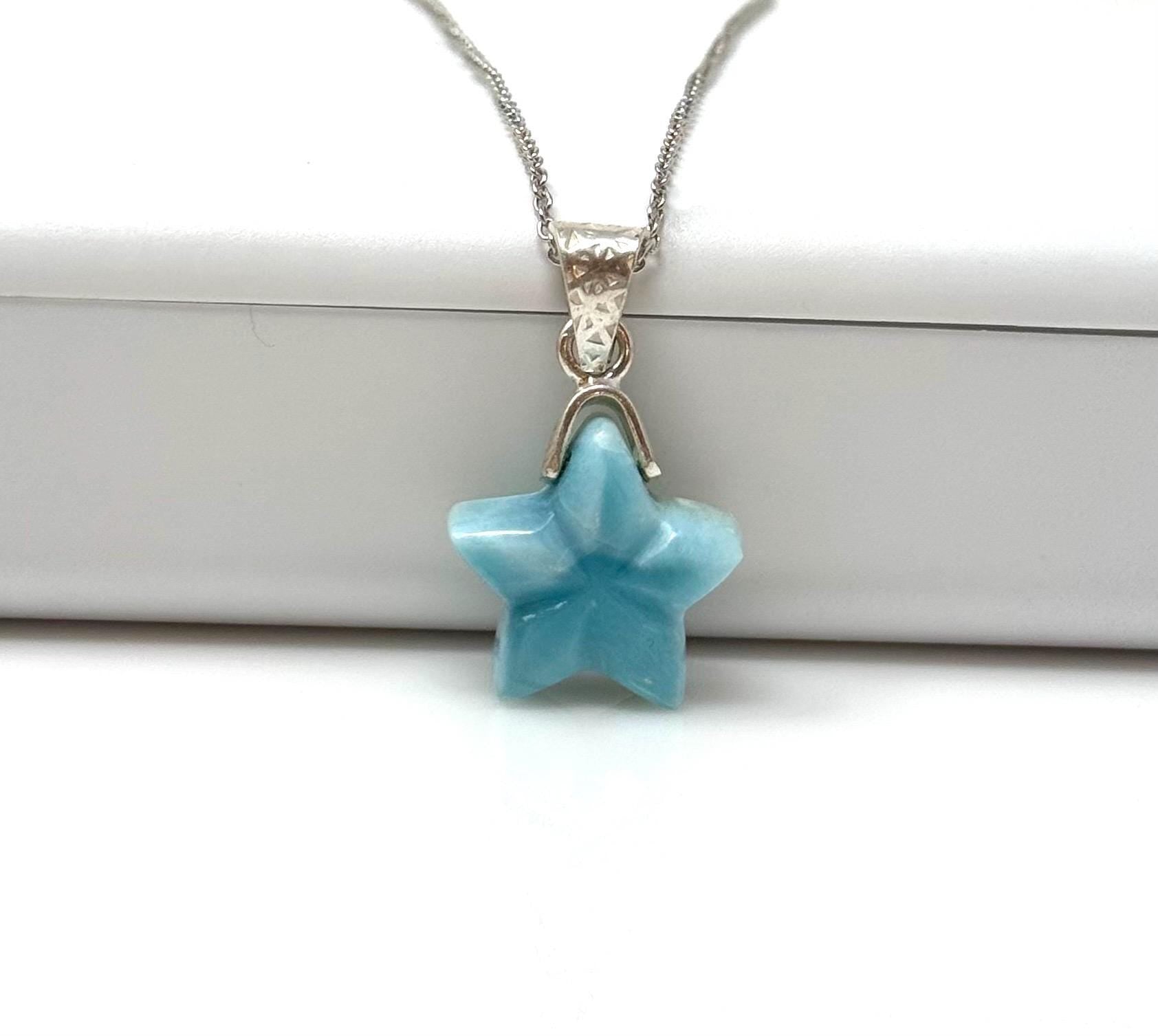 Larimar Gemstone Necklace, Hand Carved Larimar Star Necklace, Bohemian Jewelry Gifts, Dominican Republic Larimar Necklace, 1.30” x 0.75”