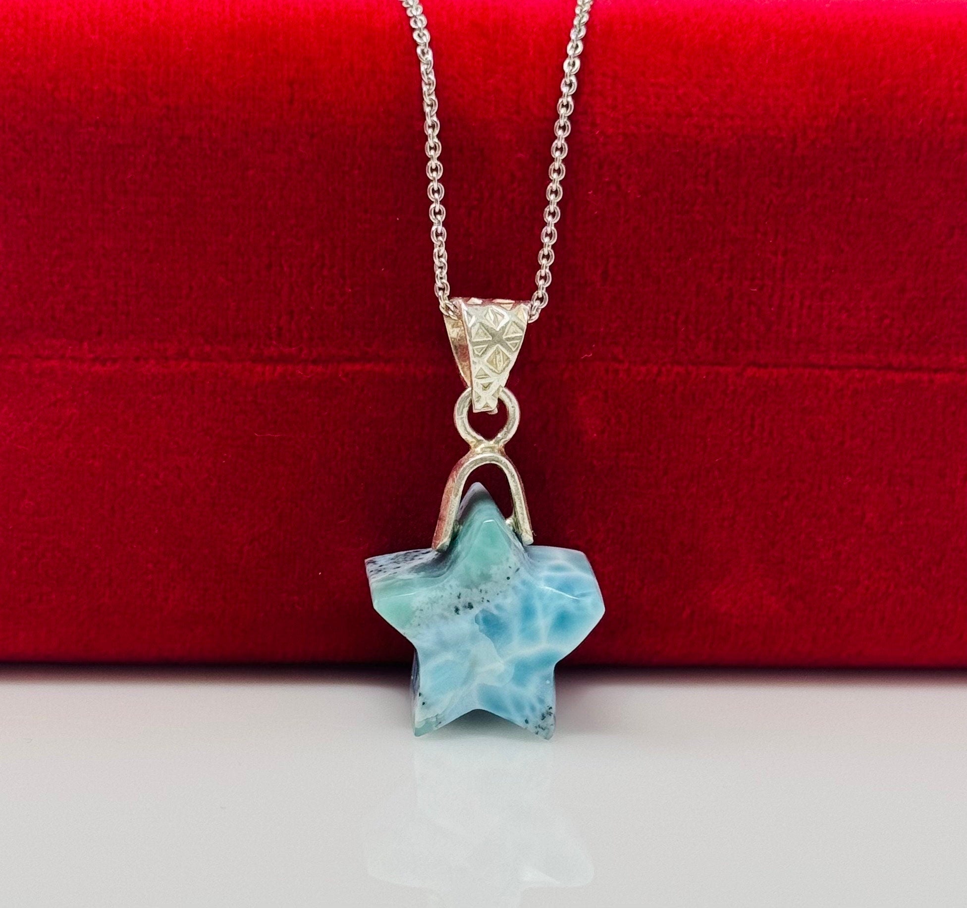 Larimar Star Necklace, Sterling Silver Hand Carved Natural Dominican Repulic Larimar Pendant Necklace, Bohemian Jewelry Gifts for Her