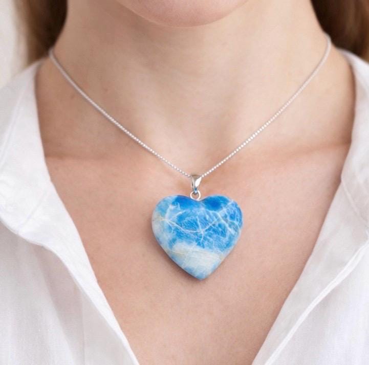 Large Natural Larimar Heart Pendant, Sterling Silver Heart Chakra Healing Crystal Jewelry, Ocean Stone Bohemian Jewelry Birthstone Gift
