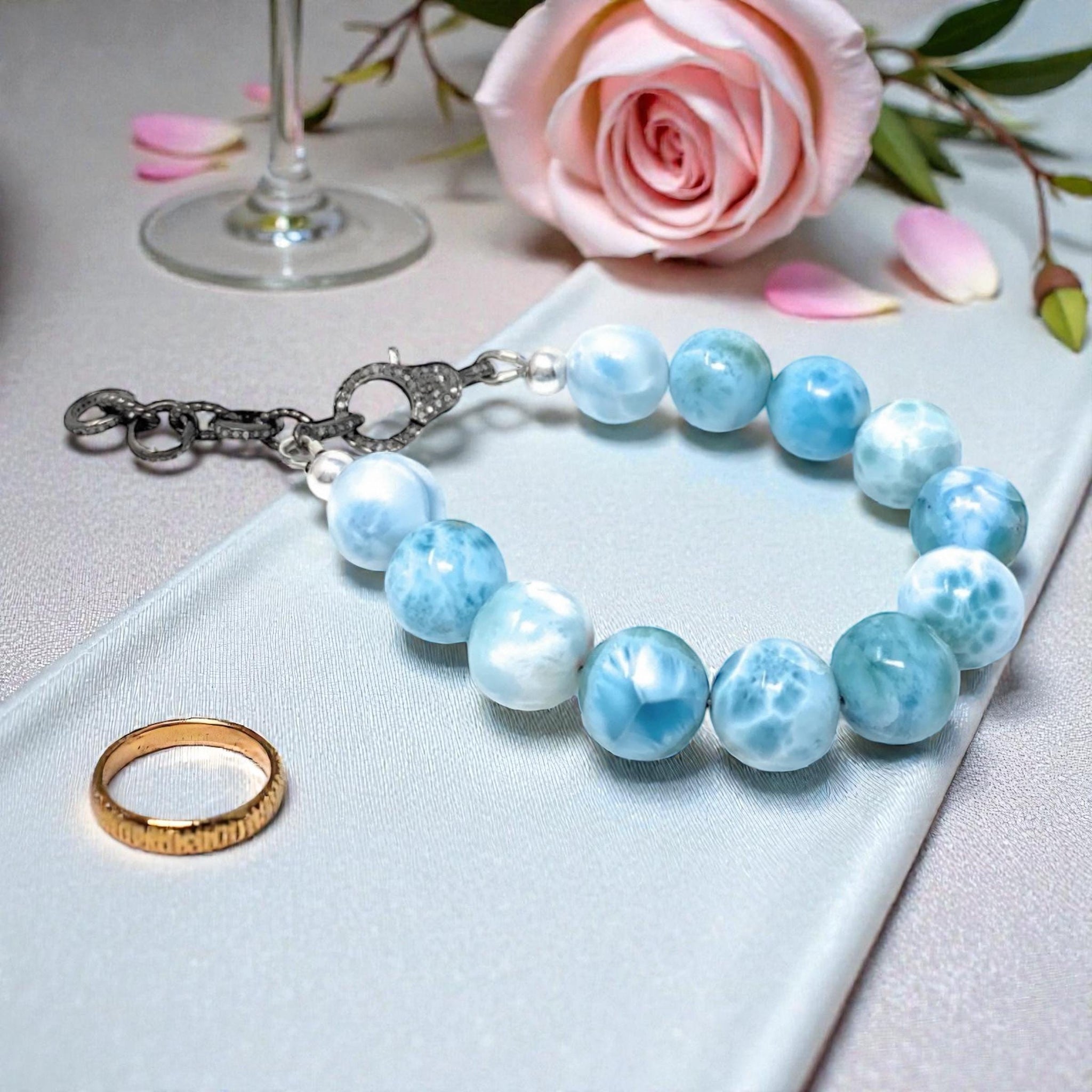 Infuse your look with the mesmerizing beauty of this one-of-a-kind bracelet. Crafted with genuine Larimar, a semi-precious stone known for its soothing, calming properties, this adjustable piece is designed to promote spiritual healing and balance your throat Chakra and aura. Elevated with shimmering pave diamonds, it's a stunning accessory that will transform any outfit from ordinary to extraordinary. Slip it on and let its aura-boosting energy empower you throughout your day.
