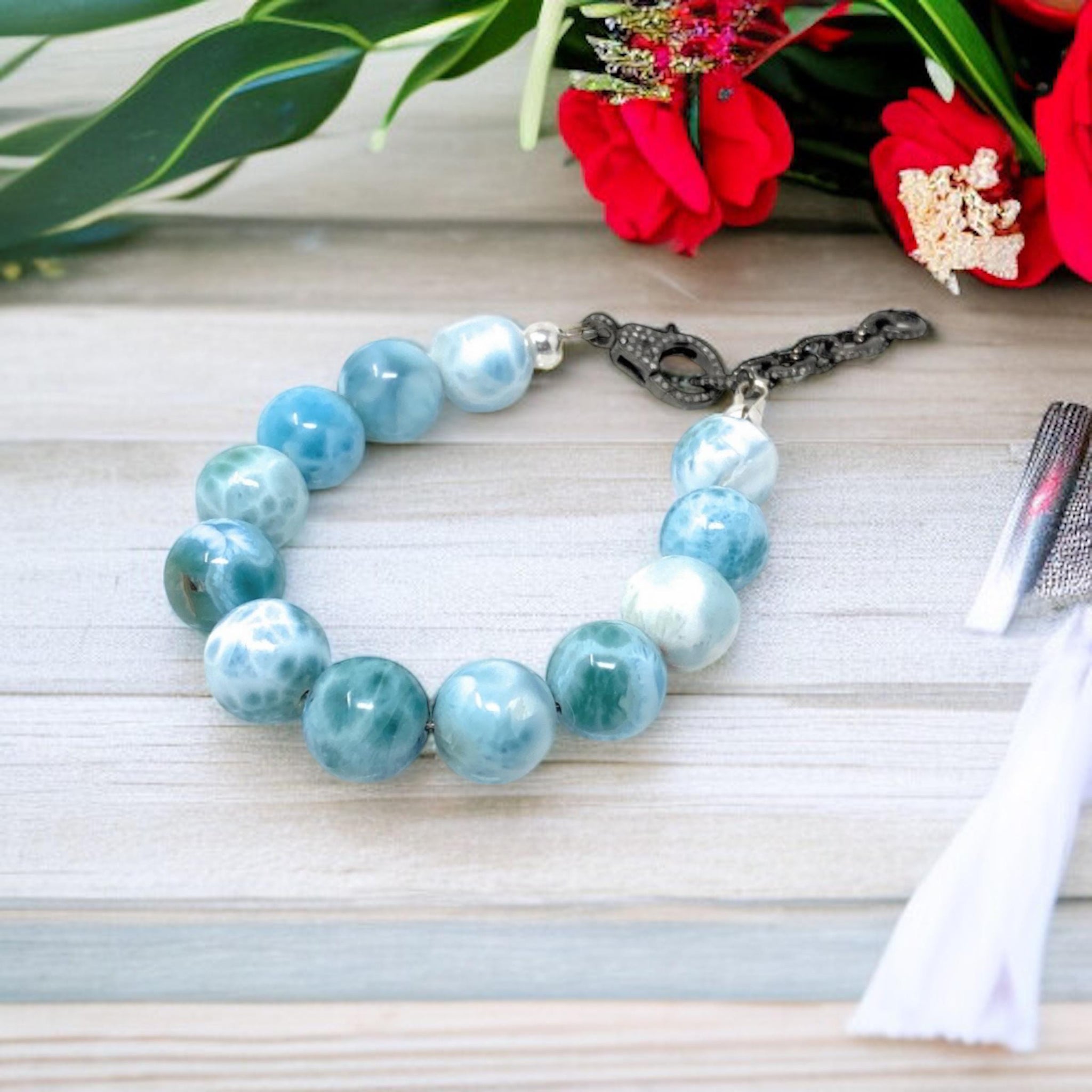 Genuine Larimar Gemstone Adjustable Pave Diamond Bracelet Jewelry.