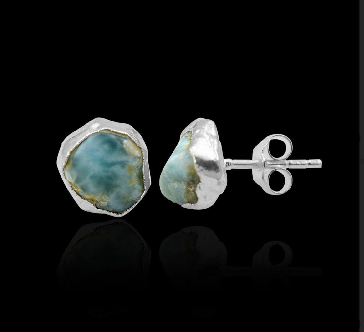 Raw Larimar Stud Earrings, Healing Raw Crystal Studs, Rough Larimar Gemstone Electroplated Stud Earrings