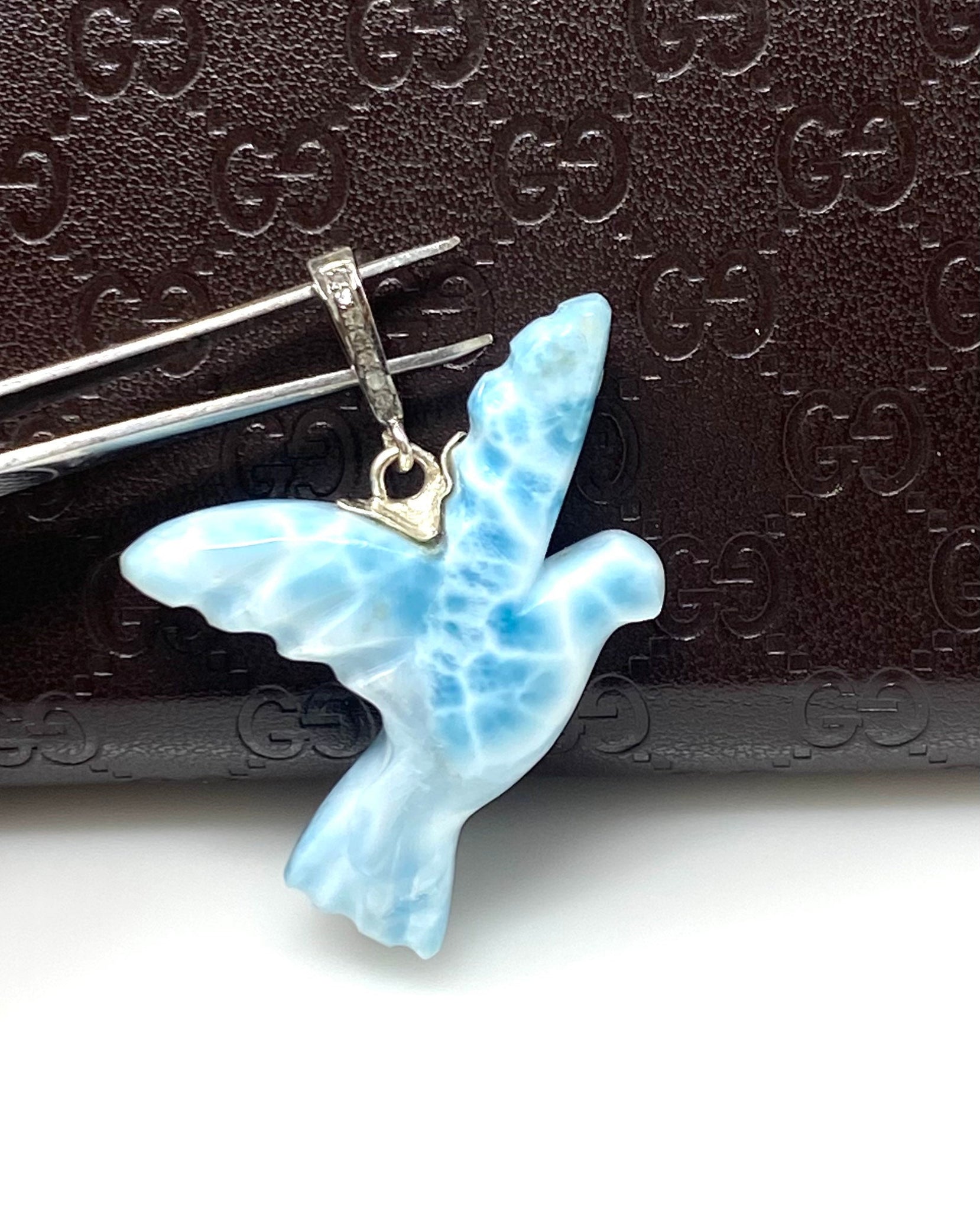 12g Rare Large Larimar Bird Pave Diamond Pendant, Silver Bohemian Jewelry, Dominican Republic Larimar Dove Pendant