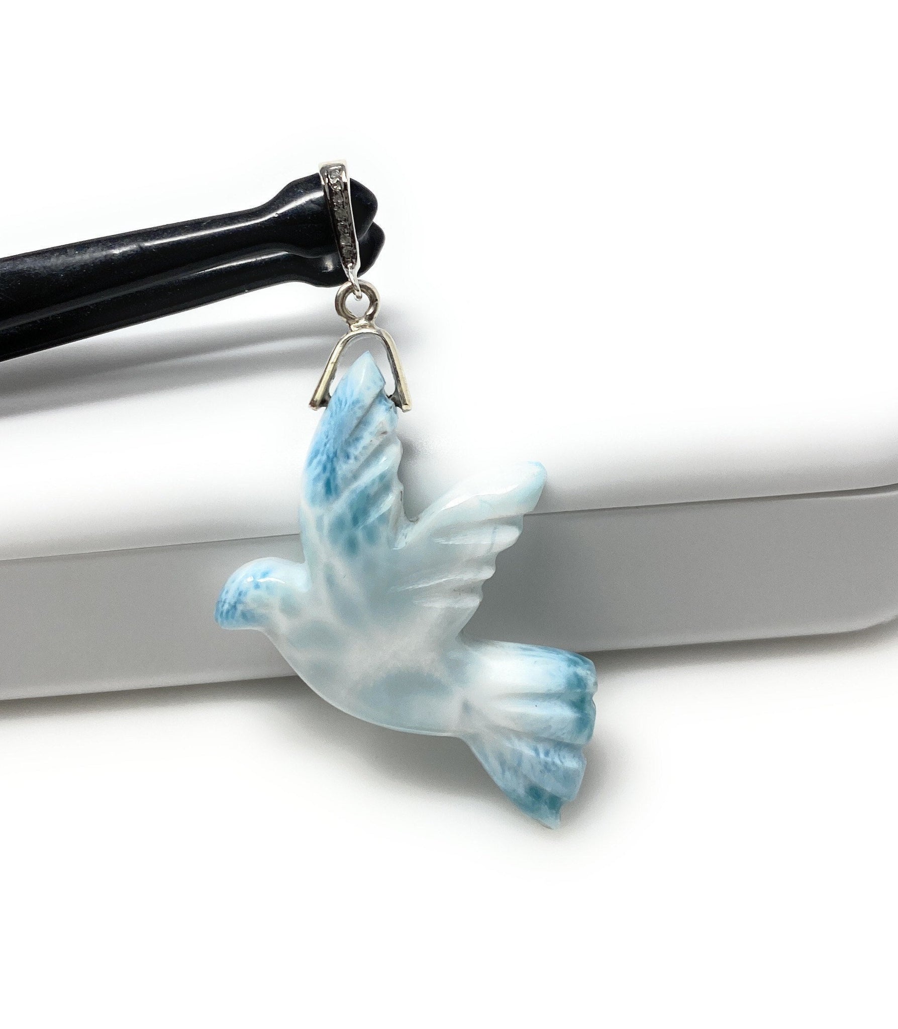 This beautiful Handmade AAA Grade Natural Hand Carved Larimar Silver Pendant with Pave Diamond Bail in Black Gray Ruthenium in the front around the diamonds over Sterling Silver is an excellent choice for any occasion and makes a great gift for the loved ones.