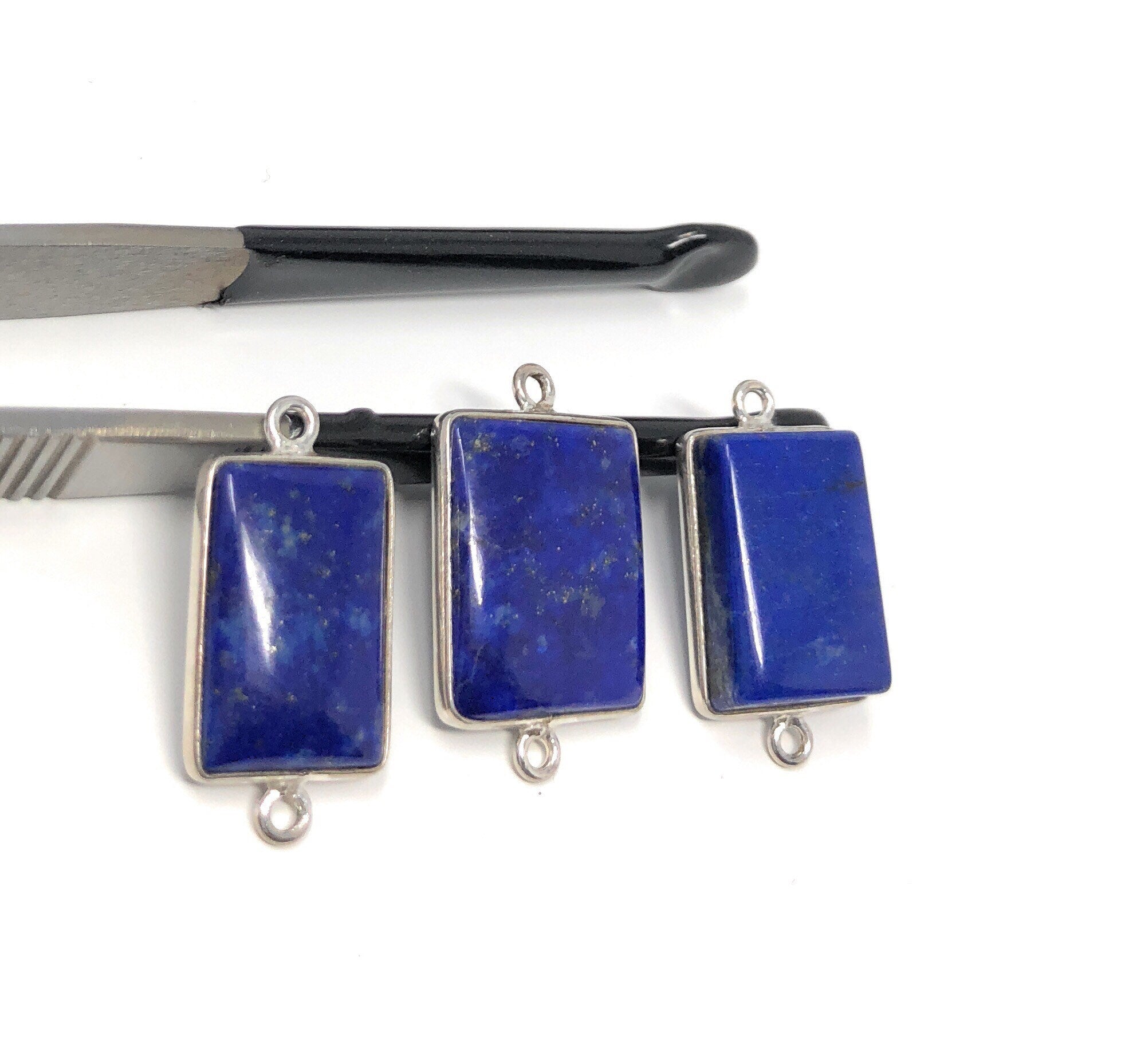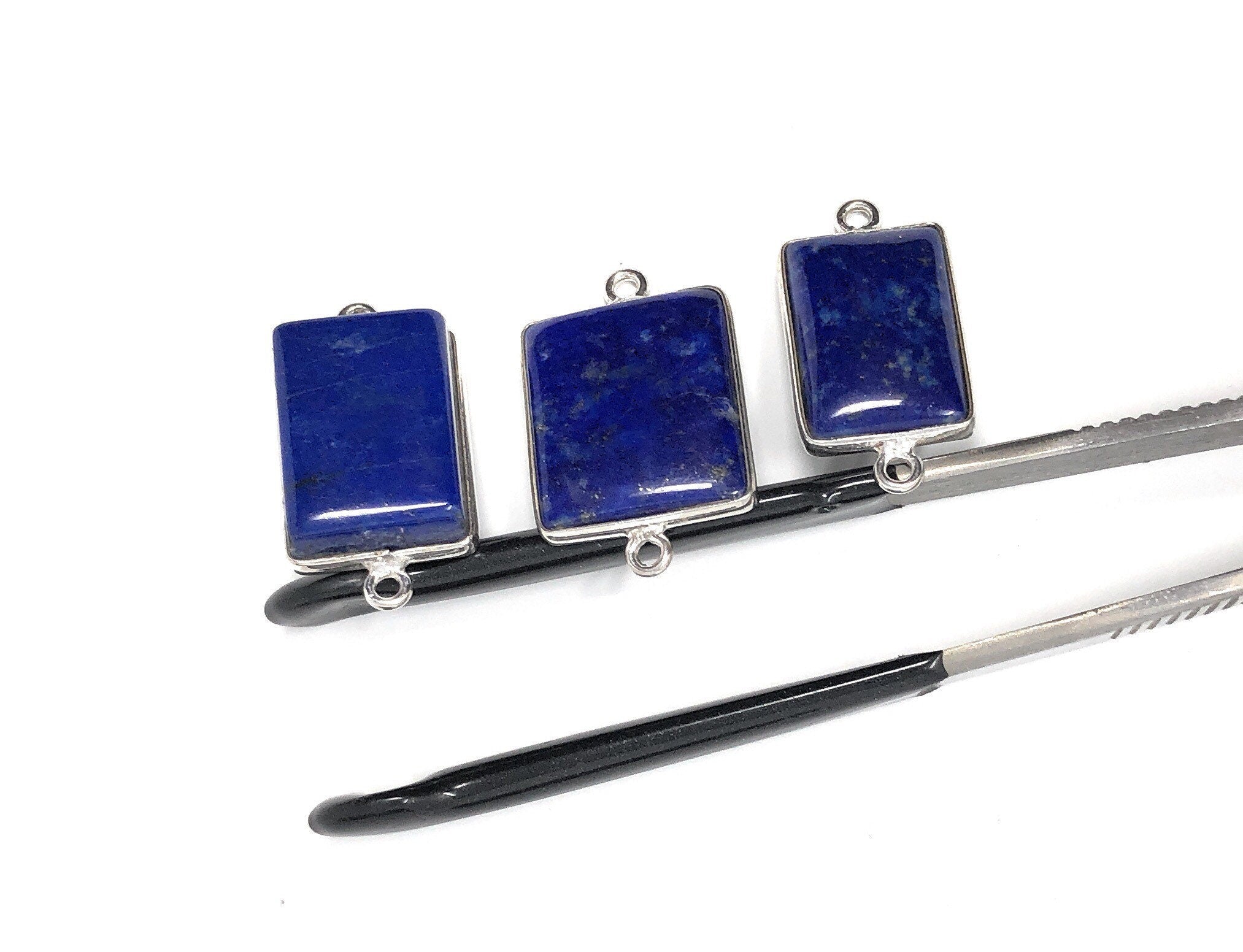 This Beautiful Bulk lot of 3 Pieces of Handmade 925 Sterling Silver Rectangle Shape Natural Smooth Polished Lapis Lazuli Gemstone Charm Connectors is an excellent choice for making any Jewelry Design. These can be used for making Charm Bracelet, Pendant Necklace or can be used to make any creative Jewelry Design.