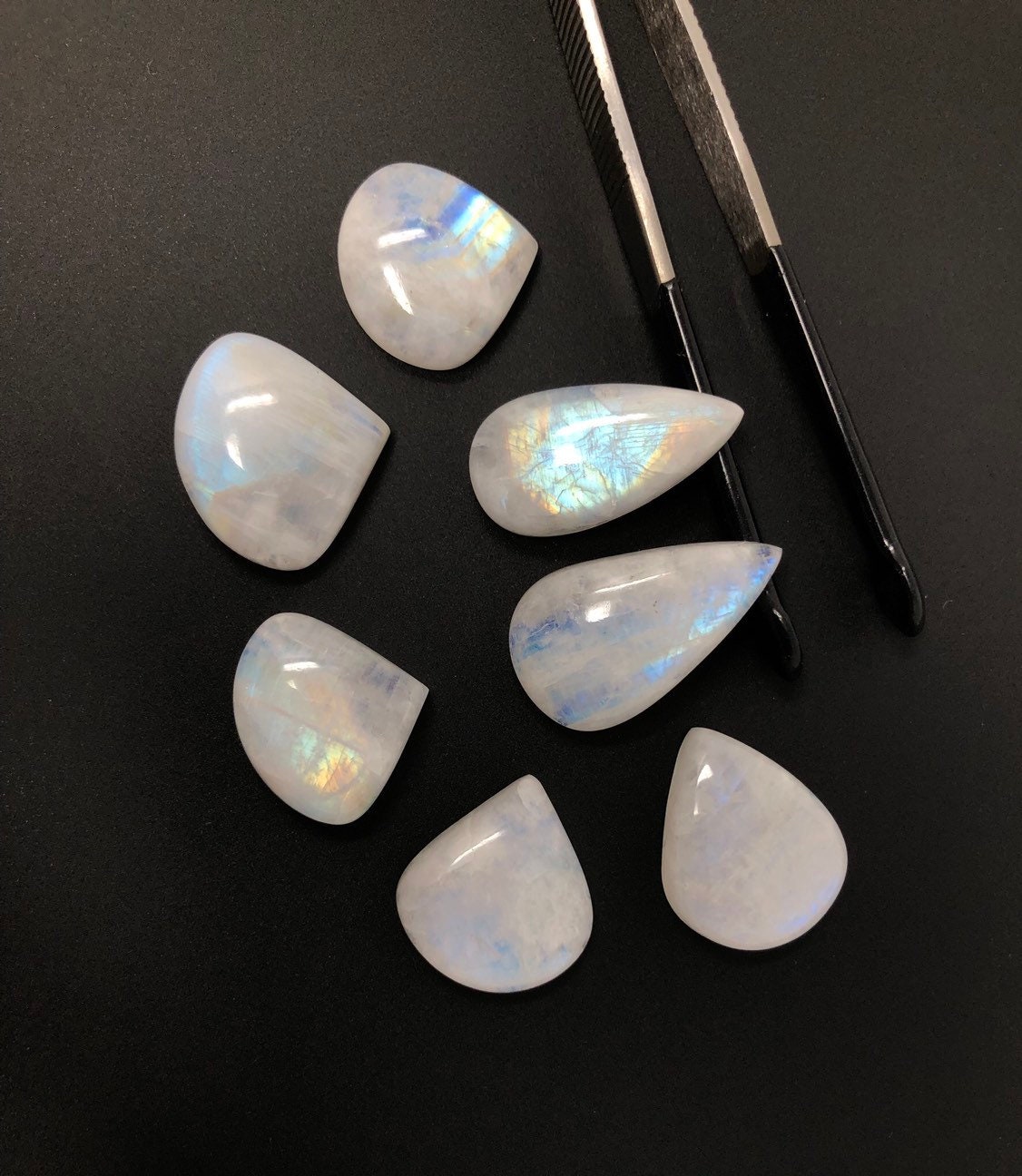 7Pcs Moonstone Cabochon, Gemstone Cabochons, Natural Rainbow Moonstone Cabochon Wholesale Lot, Wire Wrapping, Drop Shape Cabs, 25mm - 29mm