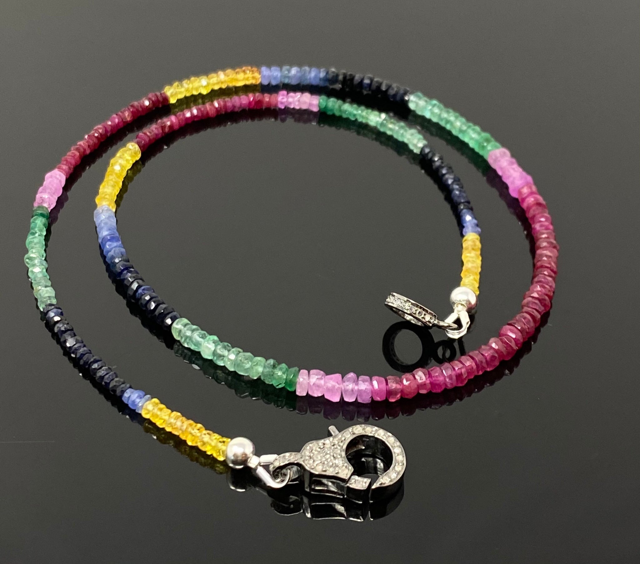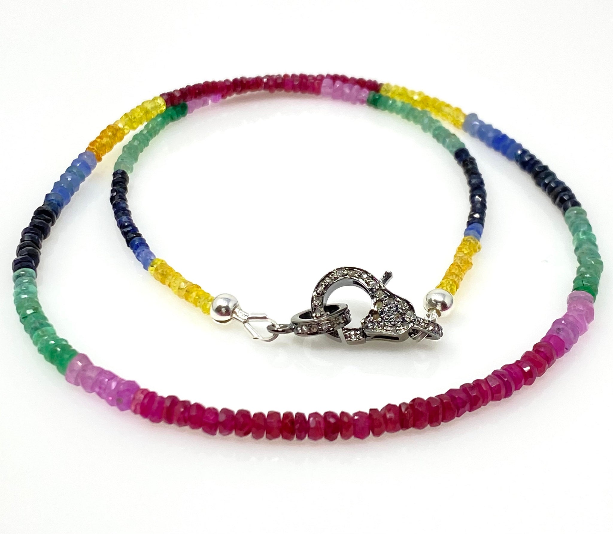 Genuine Ruby, Emerald and Sapphire Pave Diamond Necklace, Natural Multi Precious Beaded Gemstone Necklace, Spiritual Healing Crystal Jewelry