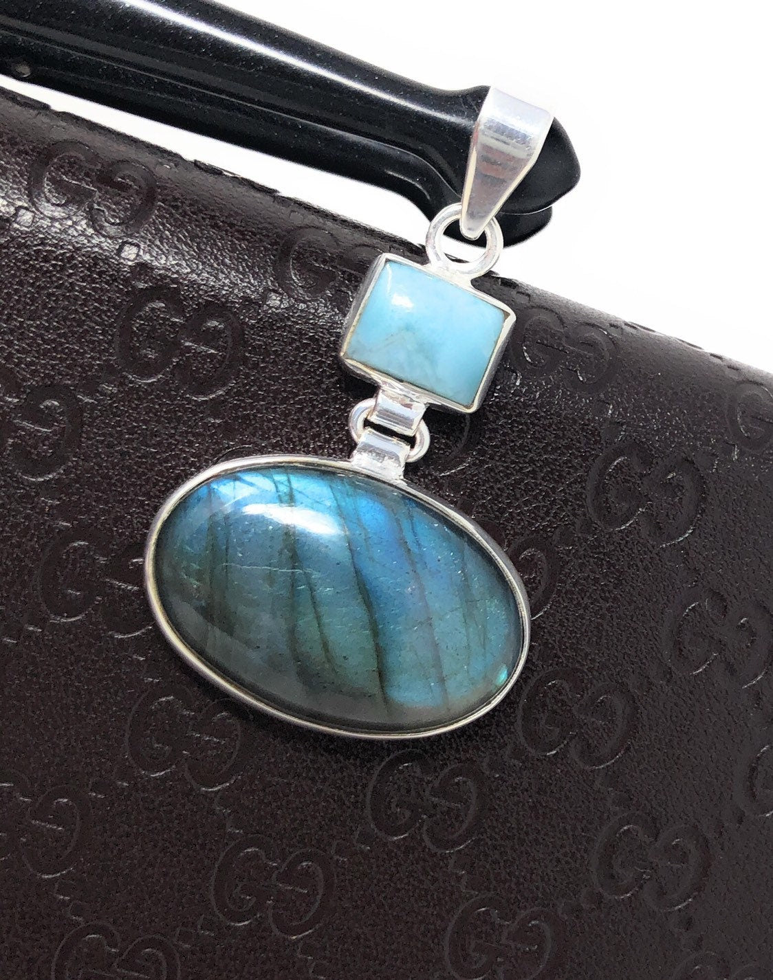 This beautiful Handmade Natural Labradorite and Natural Dominican Republic Larimar 925 Sterling Silver Pendant is made with attaching 2 Pieces together with the unique hinge design which makes the pendant flexible and is an excellent choice for any occasion and makes a great gift for the loved ones.