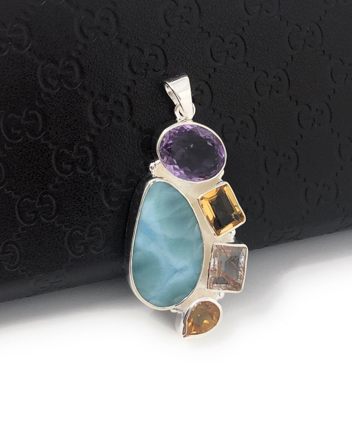 This Beautiful Handmade 925 Sterling Silver Designer Large Pendant is made with using Larimar, Citrine , Golden Rutile and Amethyst and is an excellent choice for any occasion and makes a great gift for the loved ones.